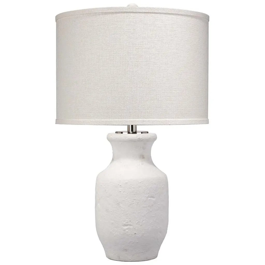 A matte textured finish adds a white sandy feel to the ceramic form of the Gilbert Table Lamp. It’s topped off with a woven grass cloth shade that adds a natural and organic touch to finish off this monochromatic piece perfectly. Material Cement Color White Finish Textured Matte White Cement Product Notes Natural cement, finish may vary Dimensions As Shown 27"h x 16.5"w Lamp Dimensions 15.5"h x 5.75"dia. footprint; 8" body diameter Shade Name Drum Shade Shade Fabric White Woven Grasscloth Shade Dimensions 16.5"top dia./16.5"bottom dia./11.5"h Cord Clear Number of Bulbs 1 Watts 100W Socket Type Medium Base (E-26) Switch Type 3-way