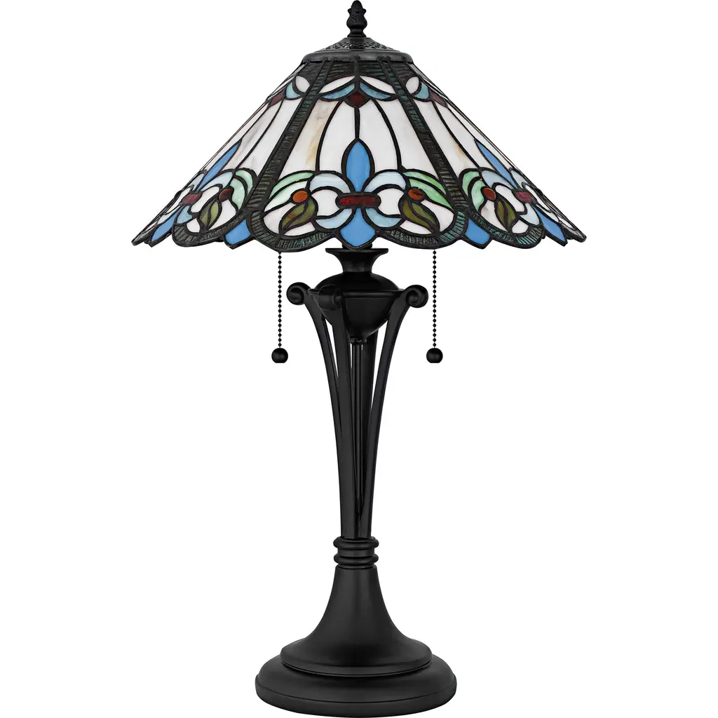 Add a touch of classic elegance to your space with the Giles table lamp. Handcrafted in the iconic Tiffany style, this lamp features a beautifully intricate multicolor glass shade in soothing hues of white, green, blue, and red. The vibrant glasswork creates a captivating play of light and color, making it a focal point in any room. The lamps sturdy resin base, finished in matte black, provides a modern contrast to the traditional glass shade, blending seamlessly with various decor styles.