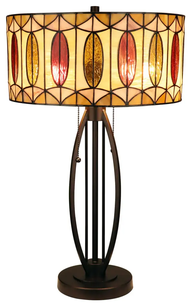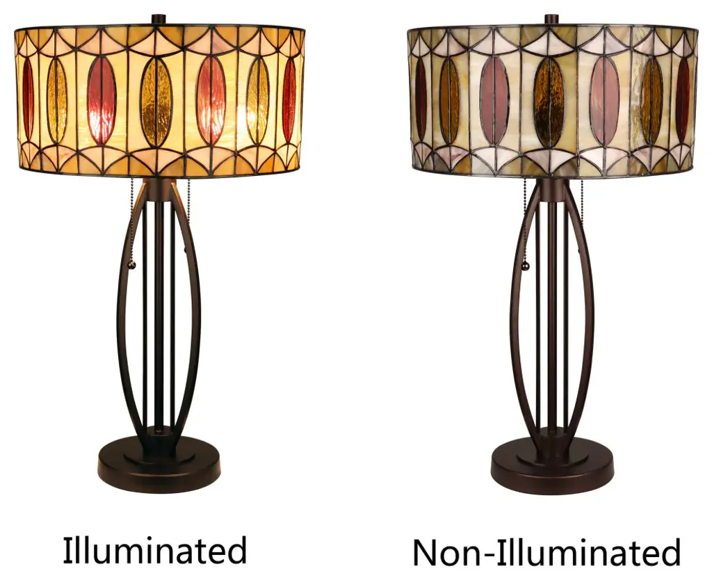 Gimm is a stunning 2 light table lamp, featuring a beautiful geometric shade. This piece would be perfect by a bed or in a foyer. Each shade is hand-crafted, using the same methods developed by Louis Comfort Tiffany in the early 1900''s. This process entails using 216 hand cut stained art glass pieces, each wrapped in fine copper foil and soldered together at extremely high temperatures to form each unique piece. Exact size to the nearest inch may vary, and exact color of each glass piece may vary due to each piece being hand crafted. First image is with the light shining through, second image is with no light. Dry listed and recommended for an indoor setting.