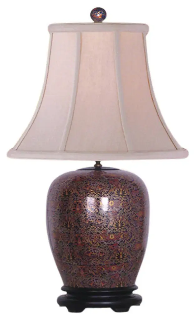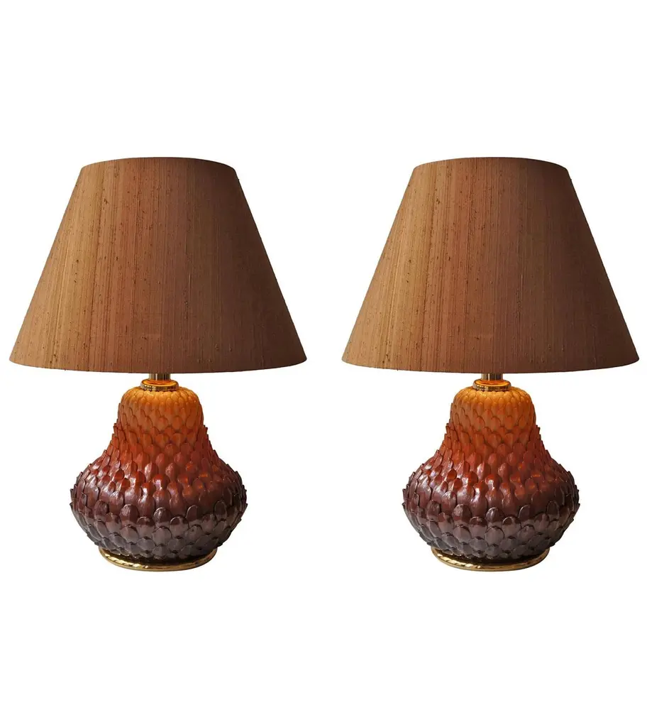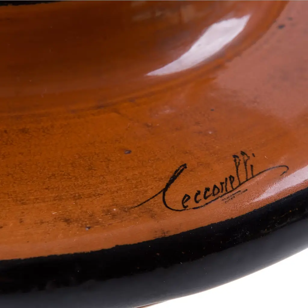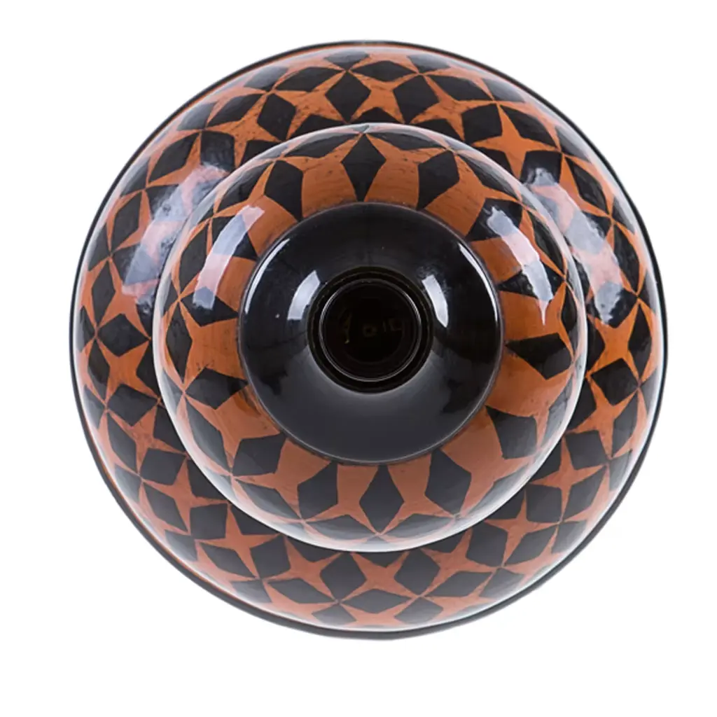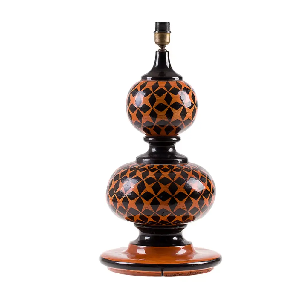 Ceramic lamp by Ceccarelli, inspired by a model dating to the 1950s. The piece is entirely made and painted by hand in black on an orange background, following a pattern of diamonds and stars on the two main bodies shaped like a pumpkin and a sphere.