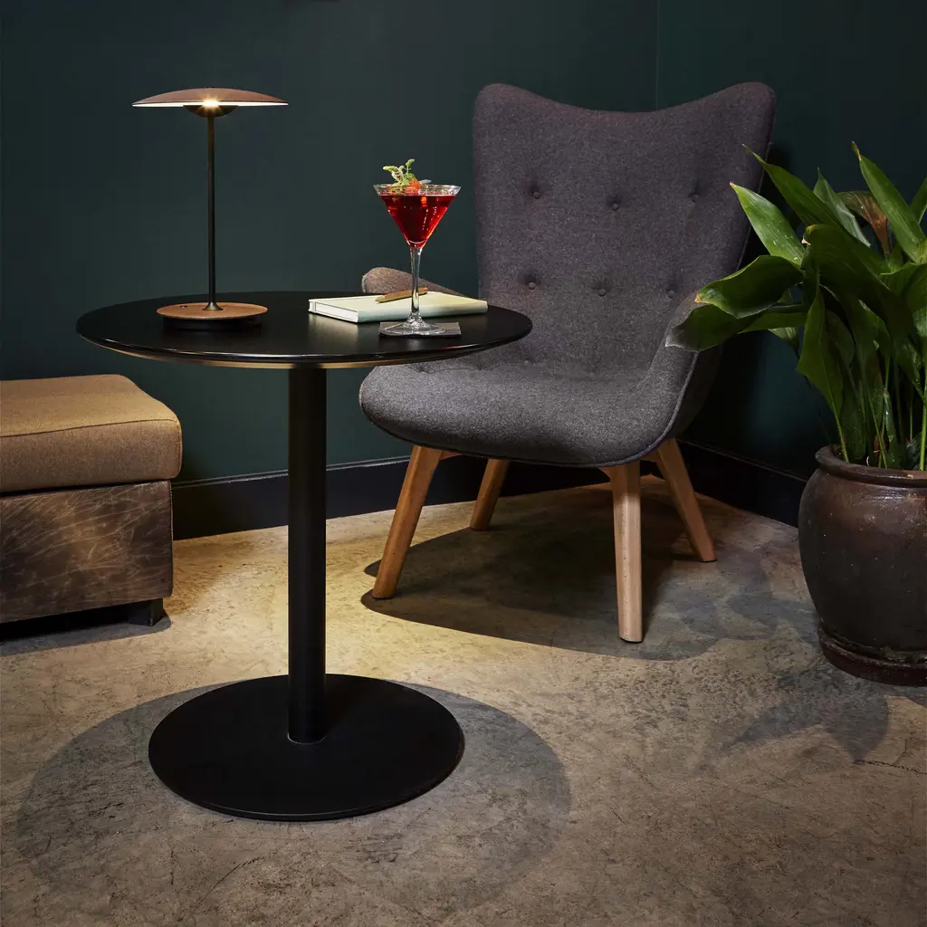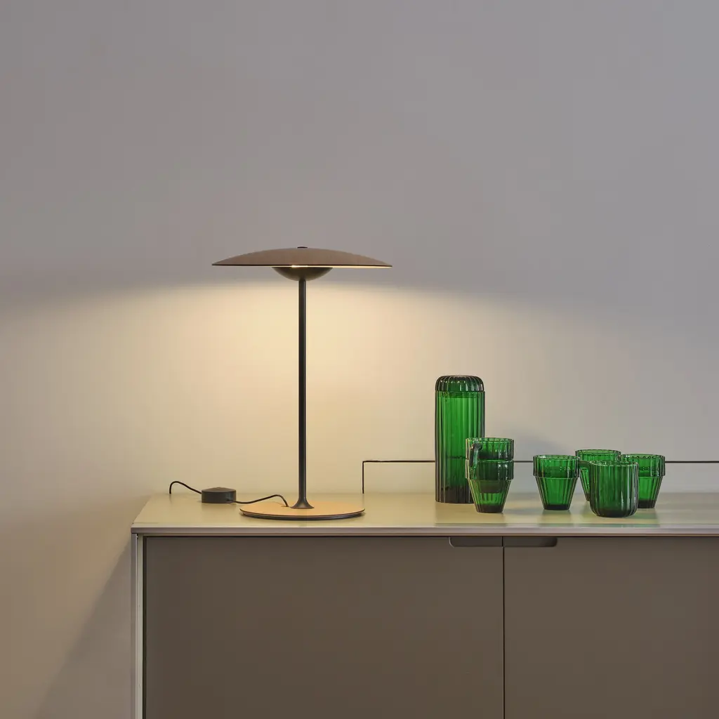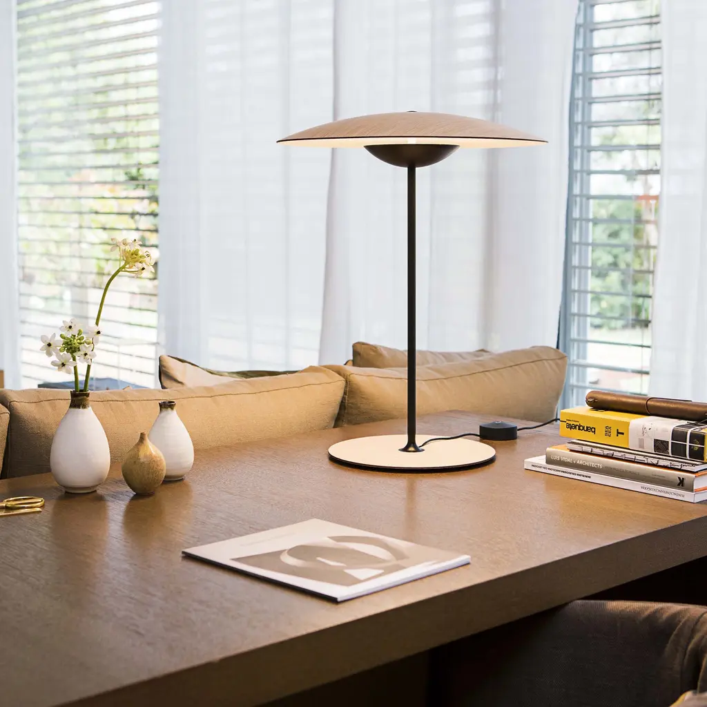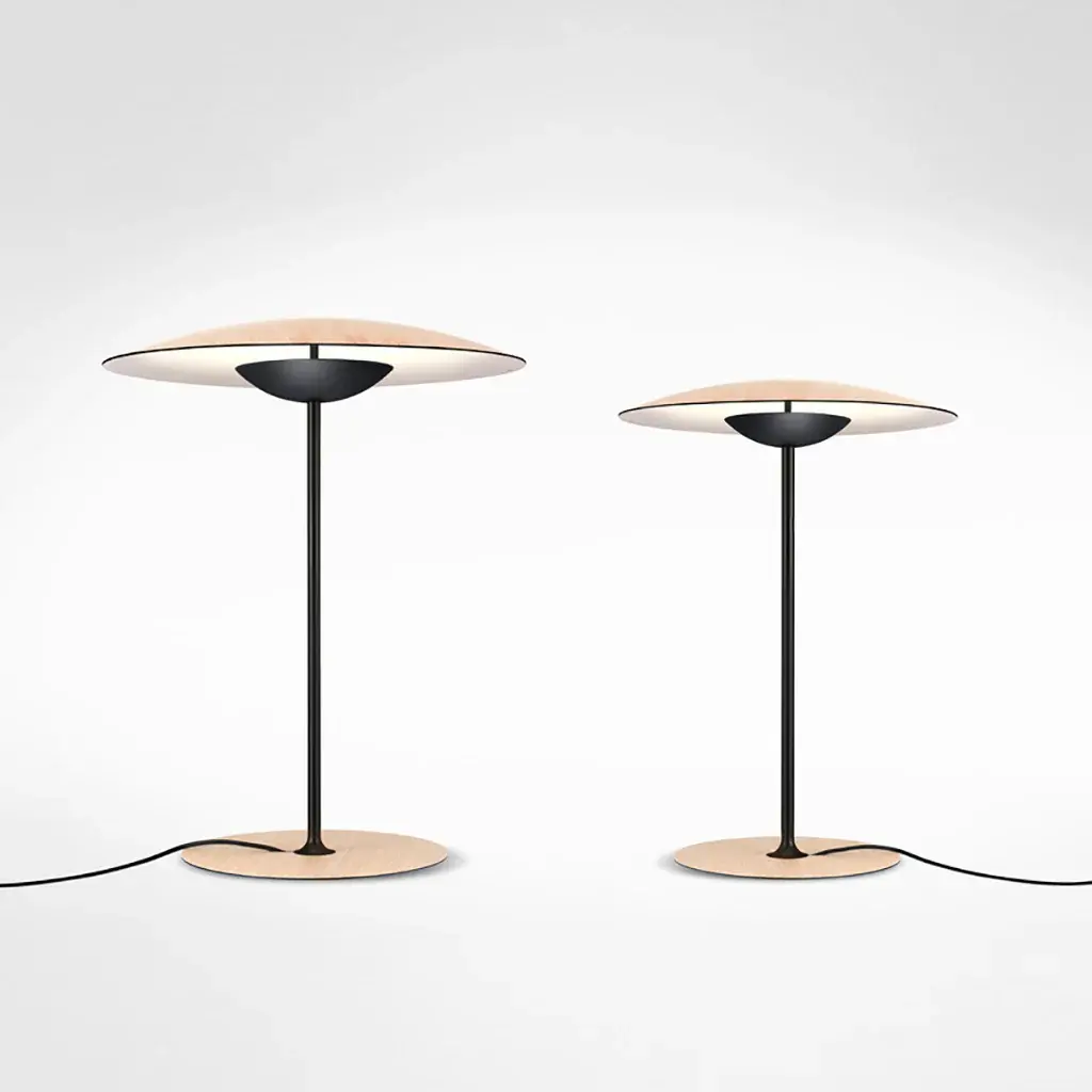 Bring a gentle glow to your space with the Ginger LED Table Lamp from Marset. Inspired by the cymbals of famed drummer Ginger Baker, this sleek lamp features an ultra-thin wood and paper shade that amplifies the warm LED light. The aluminum structure and matching disk base add a touch of modern elegance, suitable for a bedside table or at-home workspace. Highlights