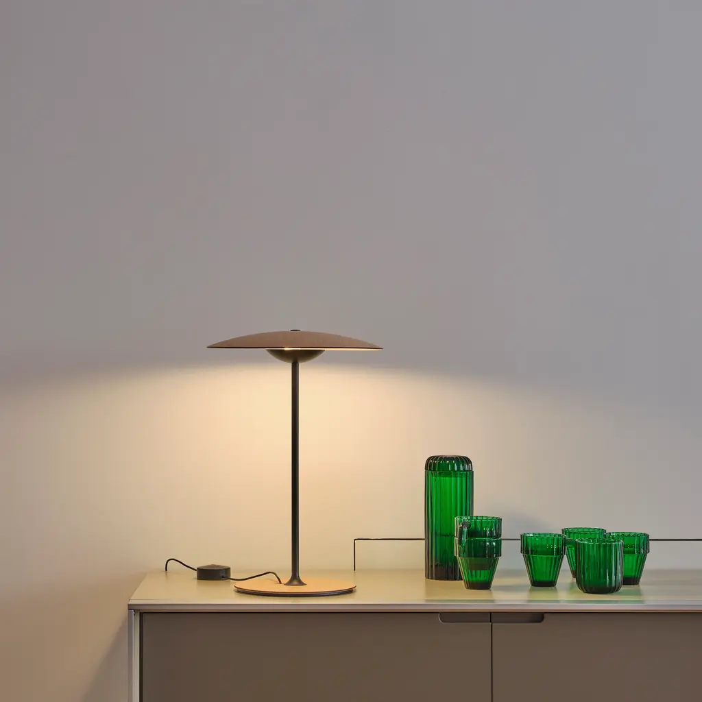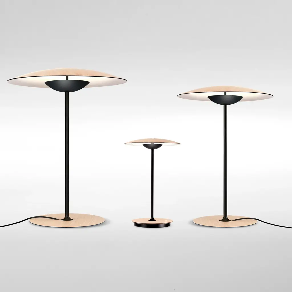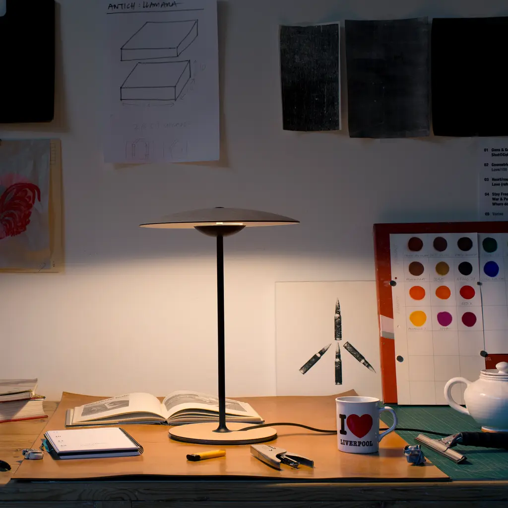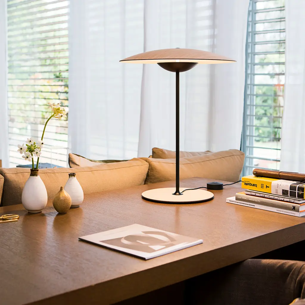 Designer Joan Gaspar's on the beat with the Ginger Table Lamp, named for legendary drummer Ginger Baker, founder of 1960s rock band Cream. It's easy to imagine the crash of the drum-kit's cymbals in the arc of the aerial shade. Achieving that refined curve takes cutting-edge technique, joining layers of paper and wood under high pressure. The result is a non-glaring LED light, thanks to the flat diffuser with its white interior to reflect the light. With an elongated matte-black metal stem and shade and pressed wood base in either natural oak or wenge, from Barcelona's Marset.