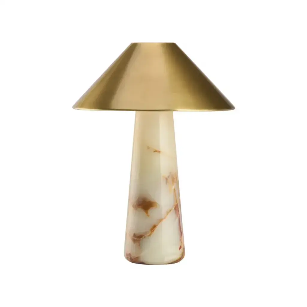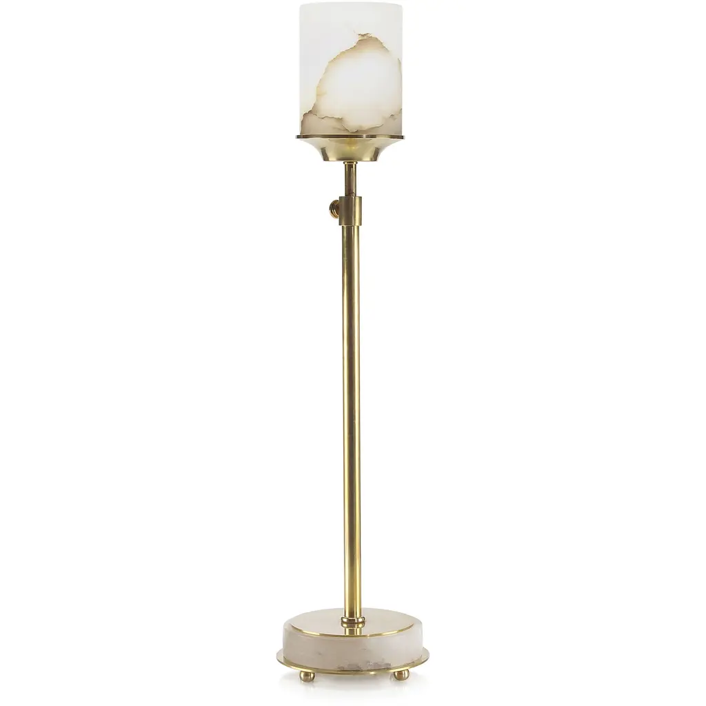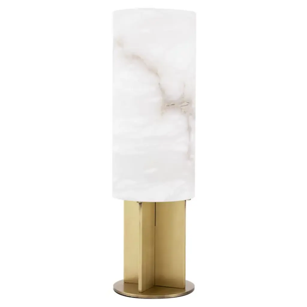 Give your interiors a smooth, sculptural glow with the contrasting, signature lines of the Giorgina Table Lamp from Eichholtz. A smooth metal disc base extends a body made from crossbars up to powerful candelabra-style lamping placed inside a cylinder shade of natural alabaster. Simple enough for contemporary settings while retaining a natural intrigue, it’s ideal when emplaced on a side table or workspace, with the translucent material blunting direct light in favor of a softer ambient glow.