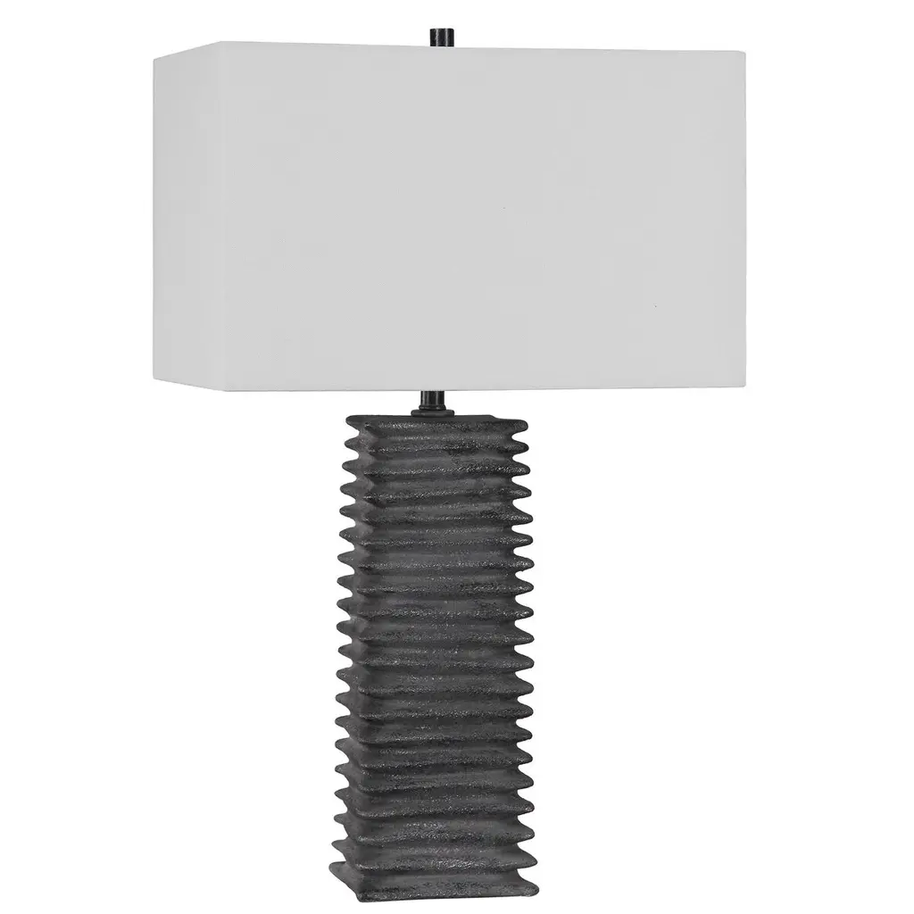 Illuminate your space with the Giovanni Table Lamp, a masterpiece of design and craftsmanship. This ceramic table lamp boasts a deep ribbed texture that adds depth and interest, while its subtle organic shape exudes elegance. The lamp is finished with a sophisticated metallic charcoal glaze, complemented by matching metal accents that enhance its modern appeal. Topping off this exquisite piece is a rectangle hardback shade crafted from white linen fabric, providing a soft, ambient glow. The Giovanni Table Lamp is a perfect blend of form and function, making it a striking addition to any room.