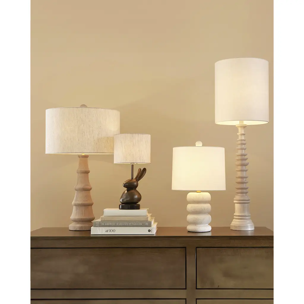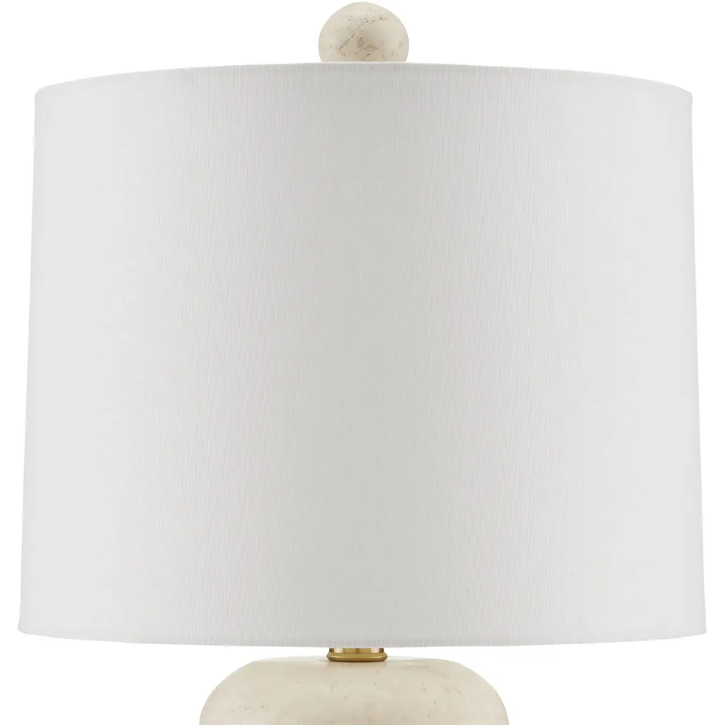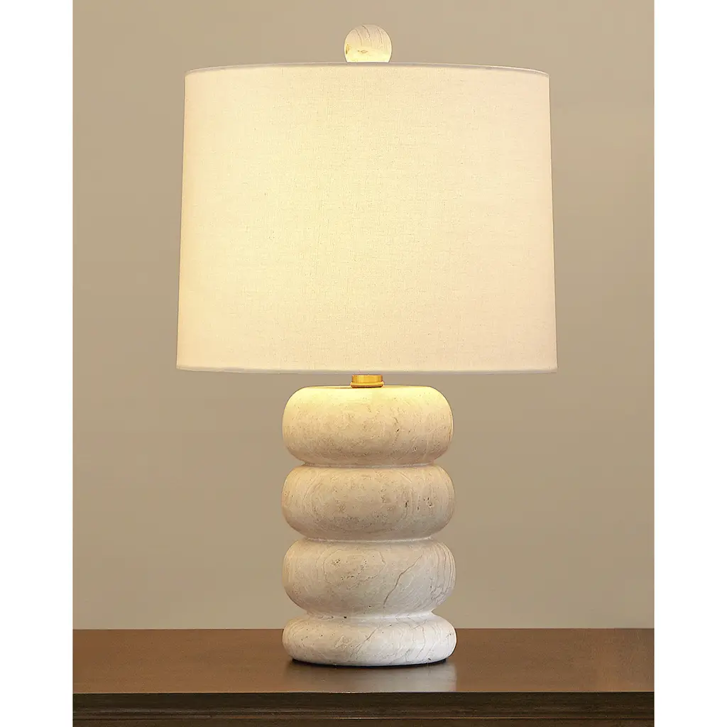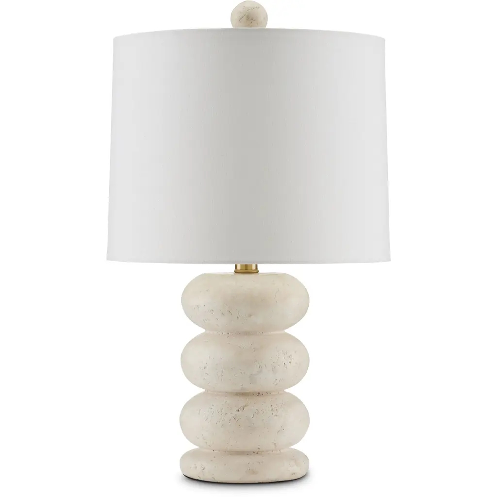 The Girault Table Lamp is carved from beige travertine, the pitting on the surface for which the material is famed bringing a wonderful character to this beige table lamp. The simplicity of the oval forms stacked along its body, the bottom one halved to act as a base, makes this a chameleon of style that will feel at home in a mid-century modern space, a contemporary room, and both transitional and traditional schematics. Given the bone linen shade is fastened to the lamp with a travertine finial, the antique brass finish on the hardware is the one warm element.