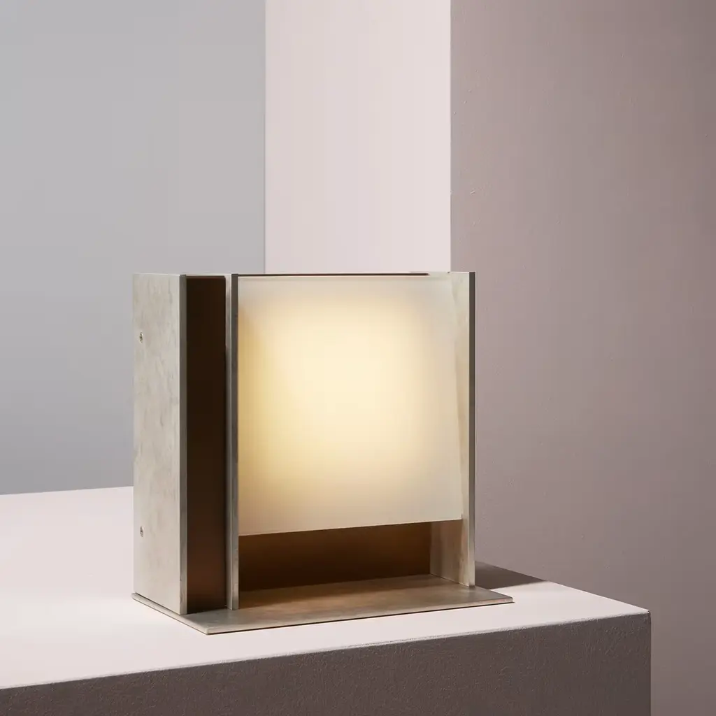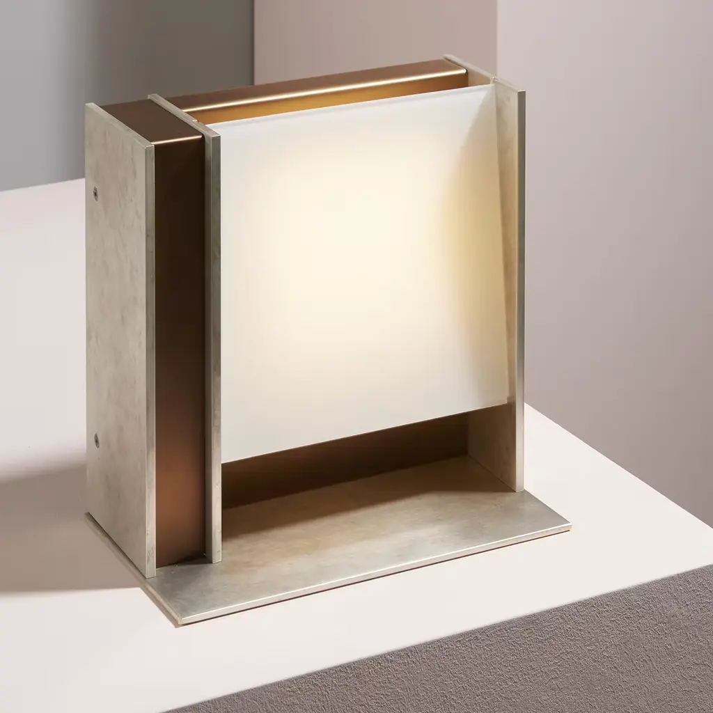 This table lamp boasts a luxurious design characterized by a sculptural silhouette combining a geometrical structure, delabré brass, and pewter. Emitting a diffused light from the squared white glass shade, the dimmable light source is a plate 36 LED 500mA 18V 9W 2700°K 900lm. This piece is also available in a version with a darkand natural burnished brass structure, please ask the Concierge for details.