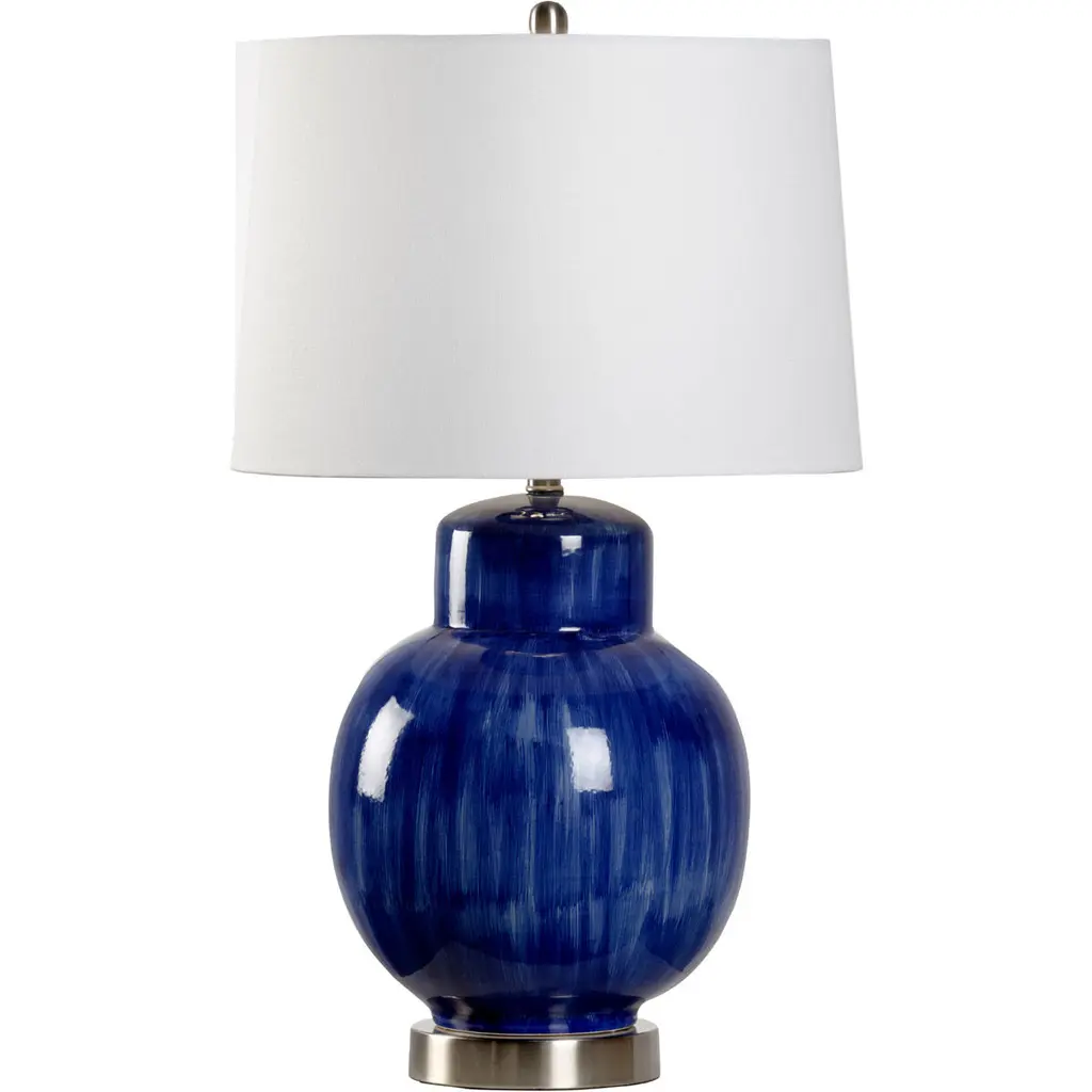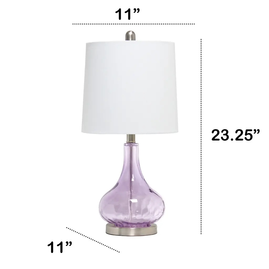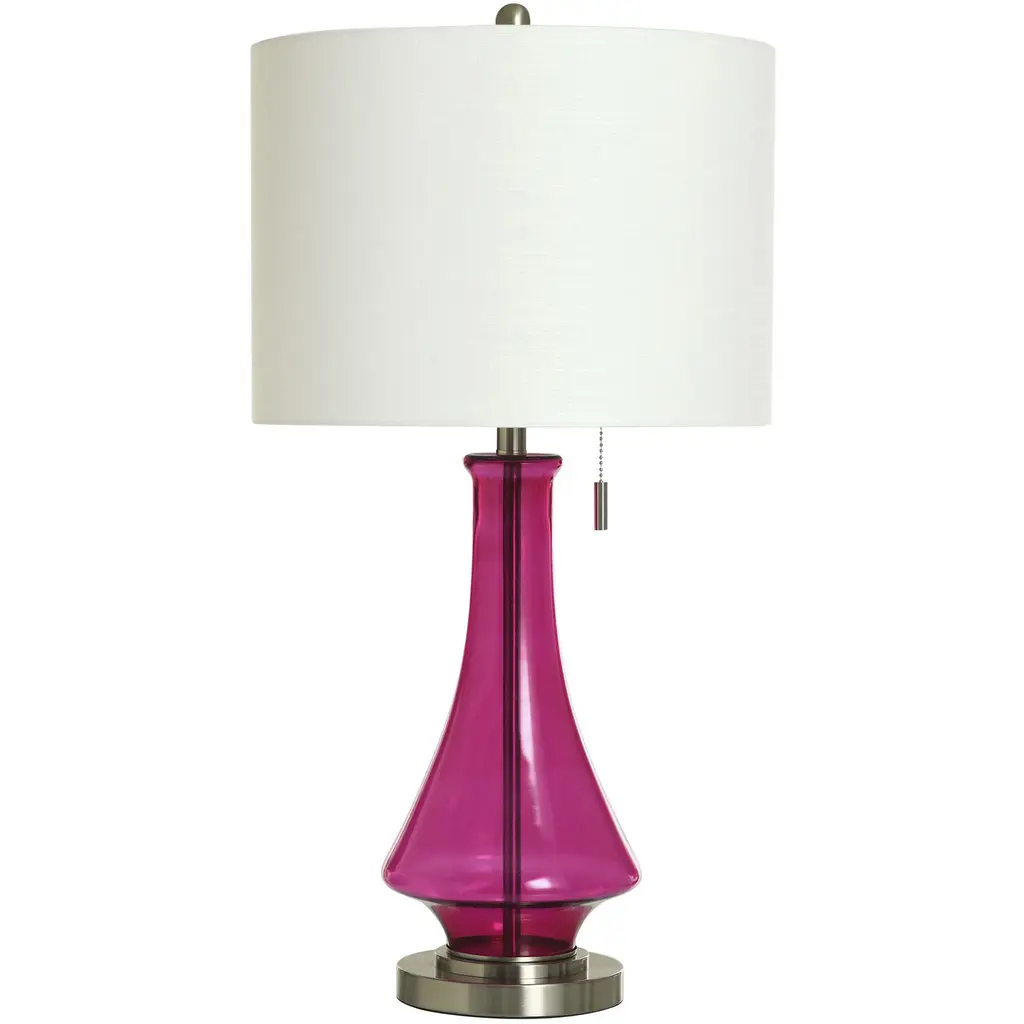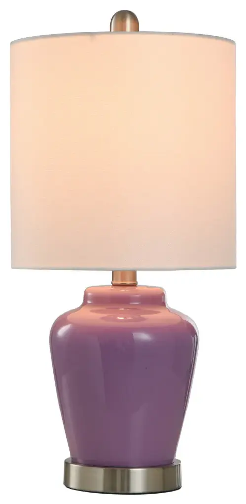 Reminiscent of a classic ginger jar, the body of this glass table lamp is both charming and versatile. Its pink finish lends a lovely hint of color to any setting, and this lamp would look right at home on a nightstand or side table. Complete with a white shade and metal base, this table lamp boasts understated yet whimsical style.Features: Style: TransitionalFinish: Lilac, Brushed SteelShade Finish: WhiteMaterial: Glass, MetalShade Material: Polyester FabricLength: 9 inchesWidth: 9 inchesHeight: 18.5 inchesVoltage: 110VWattage: 40Safety Rating: Dry Location - This item is rated for dry locations, meaning it can be used in an indoor area that is not normally subject to dampness. May include a location subject to temporary dampness provided ventilation is adequate to prevent any accumulation of moisture such as the bathroomBulb(s) Included: NoBulb Type: IncandescentNumber of Bulbs: 1 | Due to the production process, each piece is unique and no two are exactly alike. | Harp Height and Finish: 7", Silver | Finial Height and Description: 1", Round MetalBulb Shape: A19Socket Type: E26Due to lighting and monitor differences, actual colors and finishes may vary slightly from what appears online.