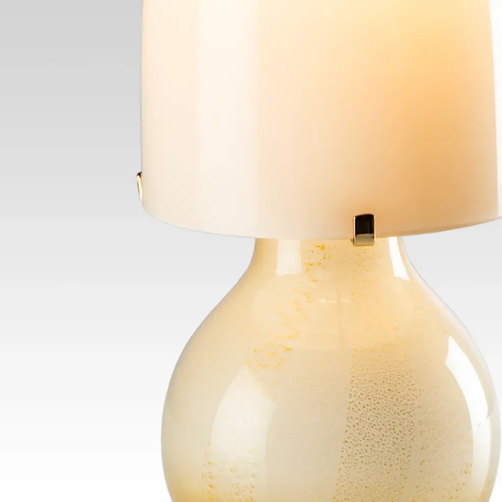 Introduce a touch of ancient Murano tradition to your space with the Venini Argea Table Lamp. The contemporary shape is complemented by precious metal leaf, creating a unique aesthetic as the leaf breaks during the blowing process. Opaline and transparent glass, along with chrome or gold-plated metal, elevate this as a luxurious addition to your decor.