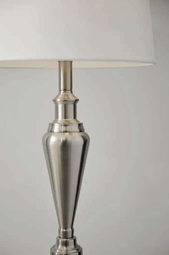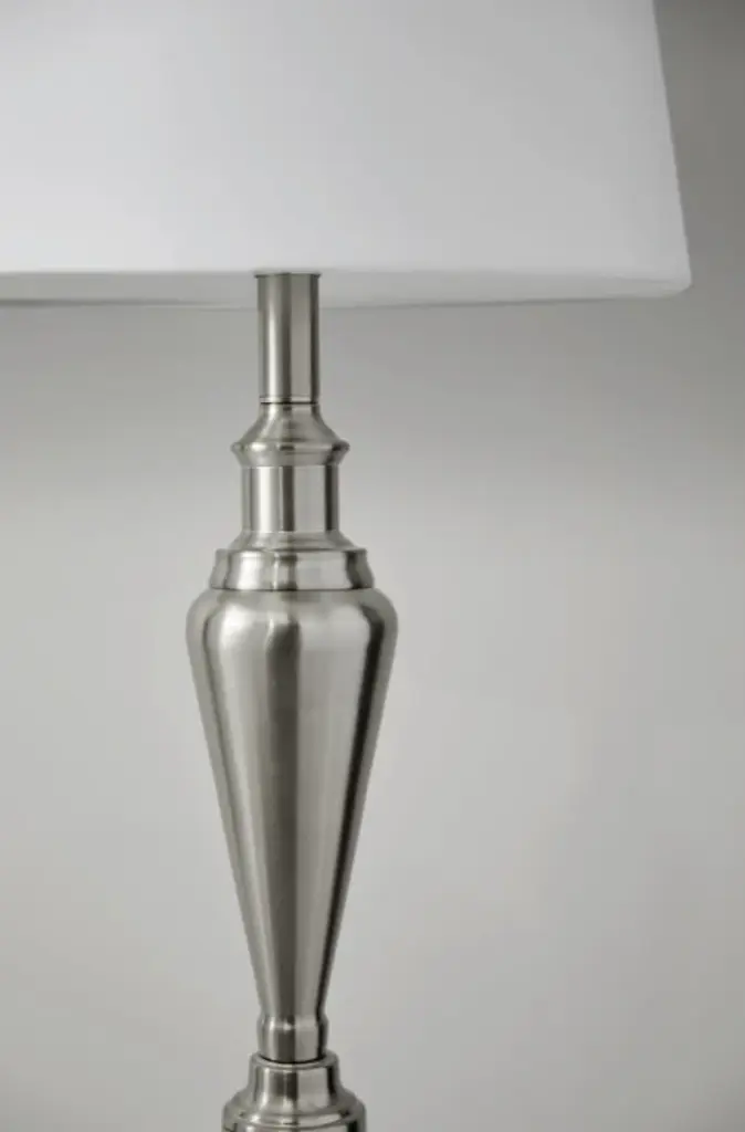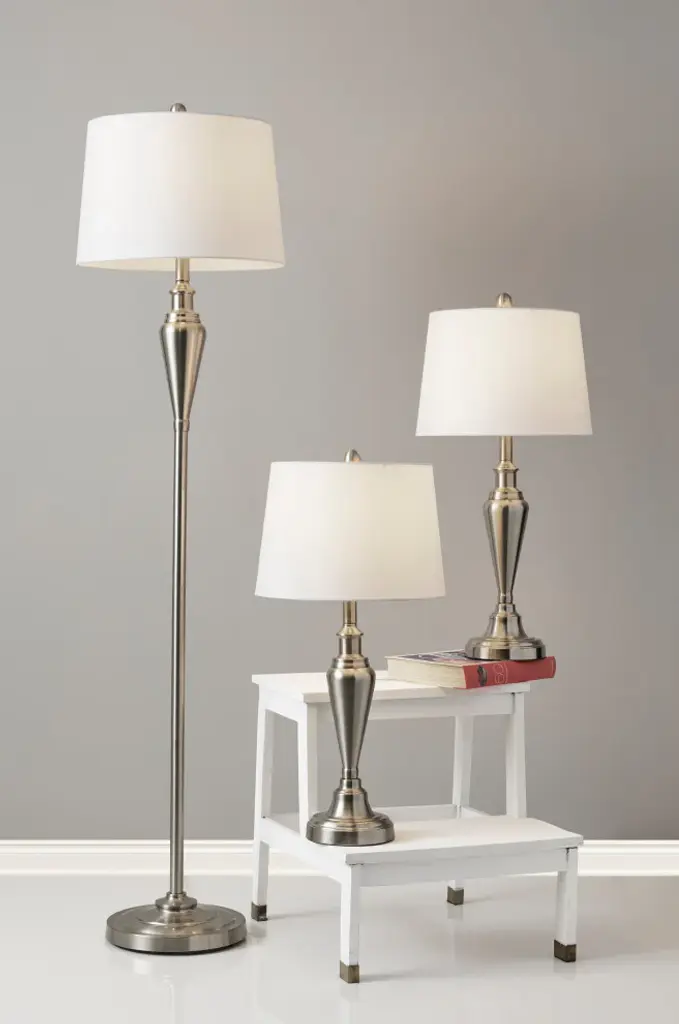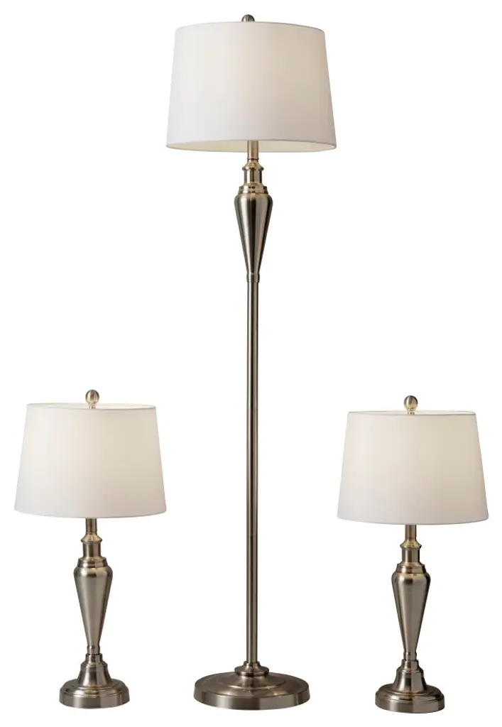 This elegant brass finished lamp set will make the perfect addition to your home. It comes with two table lamps and one floor lamp. It has a fine antique brass finished base with a textured white linen hardback shade. This product is UL/ETL Listed. Each lamp takes a 150 Watt bulb or LED/CFL 3-way equivalent.(Not Included)