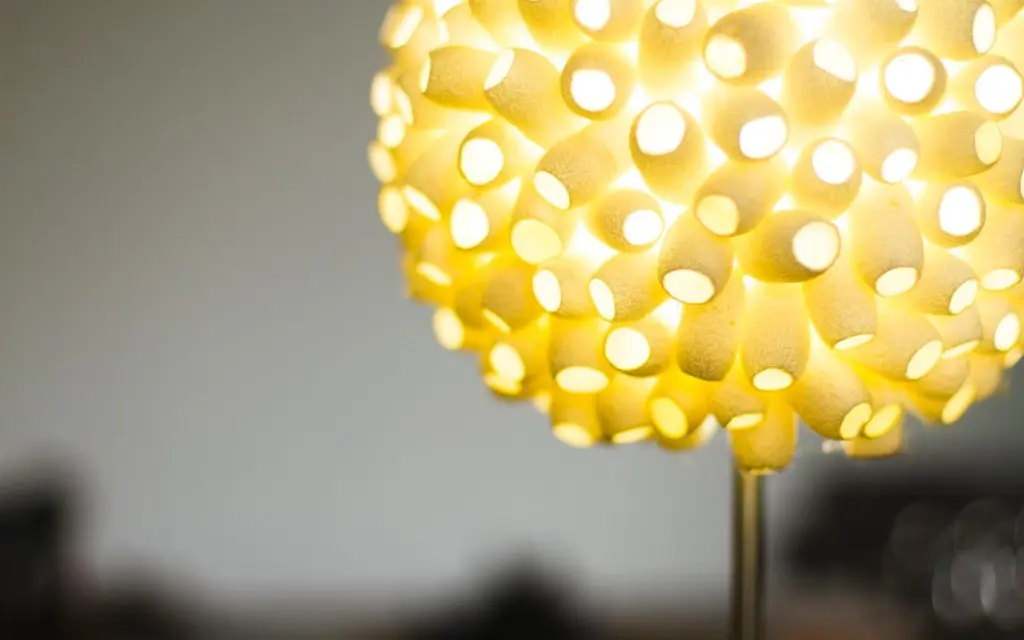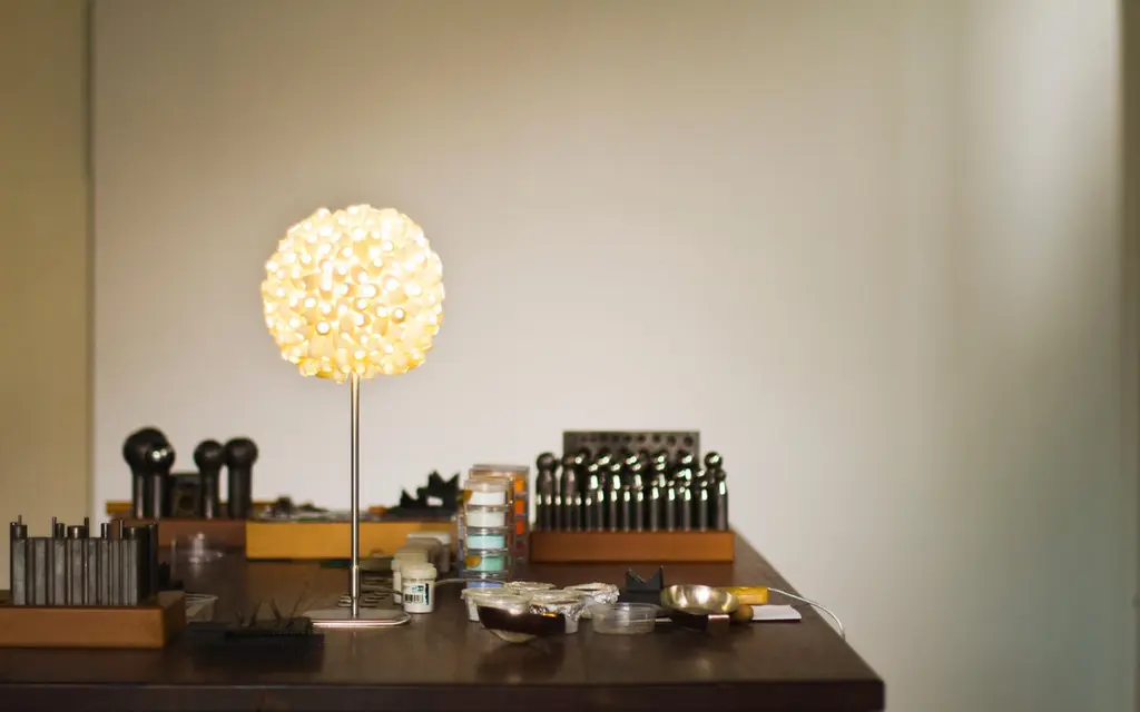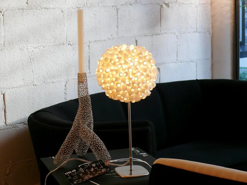Globette-EV table lamp one of Ango earlier explorations in using the silk cocoon to form an “atomised” light diffuser, where we found that light was refracted by the natural Material at different angles, so producing subtly different colors, and levels of luminosity.The Globette-EV design was developed out of these earlier researches, but here, each silk cocoon element is fixed and acts as an open light funnel conducting light from the light source to the outside, so that a highly regulated cellular world is created.The Globette-EV table light won DESIGN EXCELLENCE AWARD (DEmark), THAILAND 2012 and Good Design AWARD (GMark), JAPAN 2012Product name: Globette-EVType: Mains voltage table light Lamp base type: G9 Lamp type: G9 LED Filament 3W Diffuser Material: Silk cocoon (natural colour) Base Material: Hand finished stainless steel Size: 200 mm (8 in) W x 200 mm (8 in) W x 430 mm (17 in) H.Please note that due to the handmade nature of our products, slight variations in size may occur compared to the tear sheet. Additionally, colours may change over time and with usage.