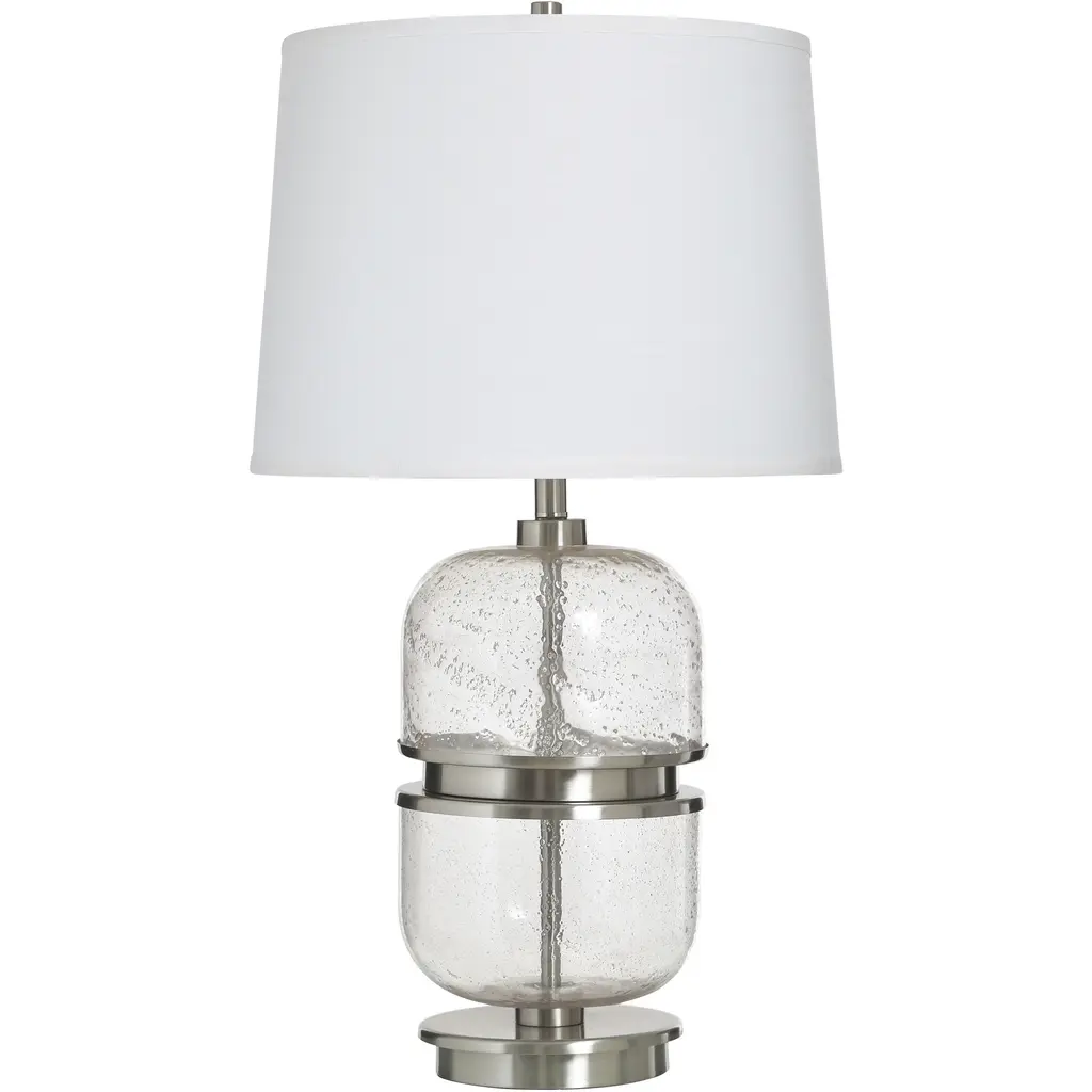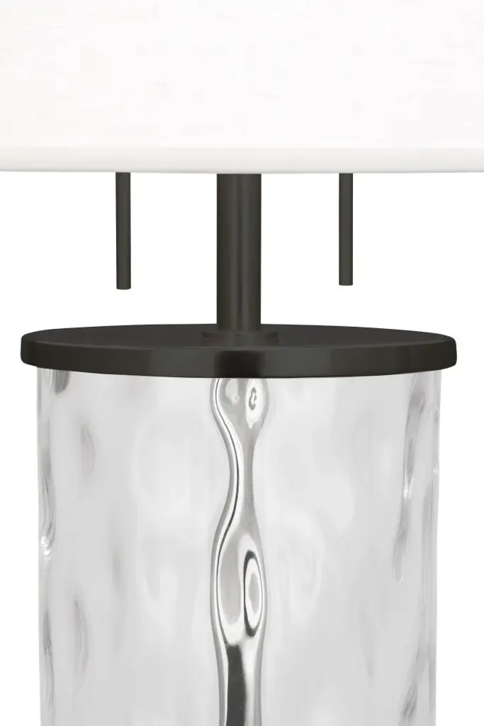 Gloria Table LampFeaturesNumber of bulb: 2Bulb type: AMax wattage: 150WVoltage: 120VSocket: Medium Plated Sheet E26Switch: Hi-Lo Pull ChainSwitch location: SocketFinish: Deep Patina Bronze with Wavy Glass BodyShade: Oyster Linen ShadeCord color: SilverUL listed: DryDimensionsShade dimensions: 16 inches top x 17 inches bottom x 10.5 inches down sideBase dimensions: 1.31 inches height x 7.5 inches width x 7.5 inches depth