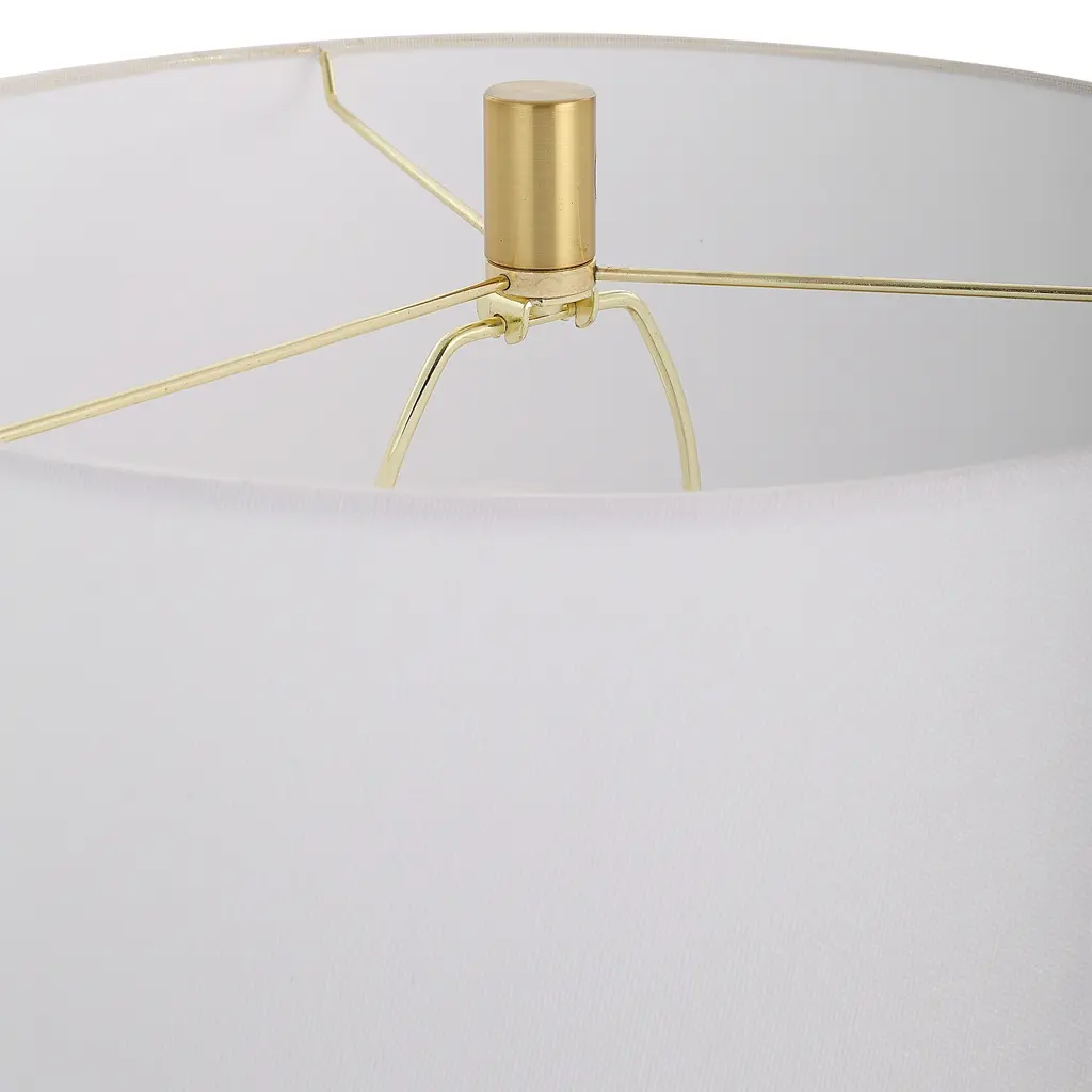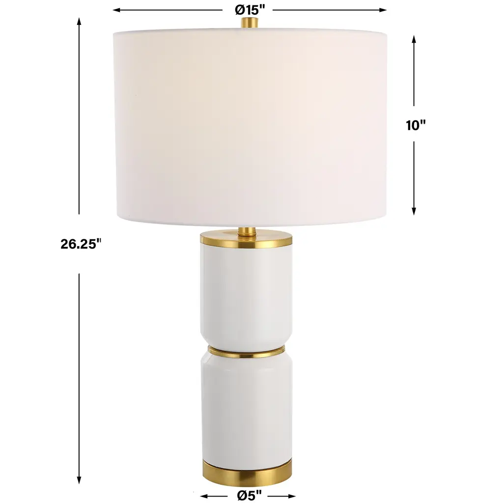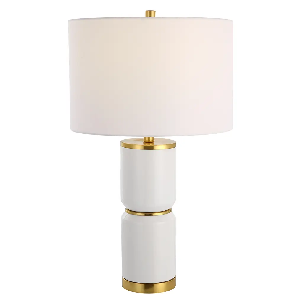 This beautiful gloss white ceramic table lamp, accented with a vibrant gold, sits atop a metal base. A thin metal band softens the wide cylinder body. A round hardback white linen shade completes the look and makes this a perfect lamp for a nightstand or on an end table in a family room. Features: Includes: One (1) Table Lamp Material: Ceramic, Metal, Fabric Finish: Gloss white ceramic Shade: Drum Hardback Shade Wattage: 150 W Bulb quantity: 1 Bulb Type: E26 (Standard) Socket Type: 3-Way Made in China Dimensions: Overall dimensions: 26.25 inches high x 15 inches wide x 15 inches deep Item weight: 7 lbs Shade dimensions: Height: 10 inches, Top: 15 inches wide x 15 inches deep, Bottom: 15 inches wide x 15 inches deep This product will be shipped to you in one (1) box. Accessories pictured are NOT included. WARNING: This product can expose you to chemicals including nickel which is known to the State of California to cause cancer. For more information, go to www.P65Warnings.ca.gov/furniture.