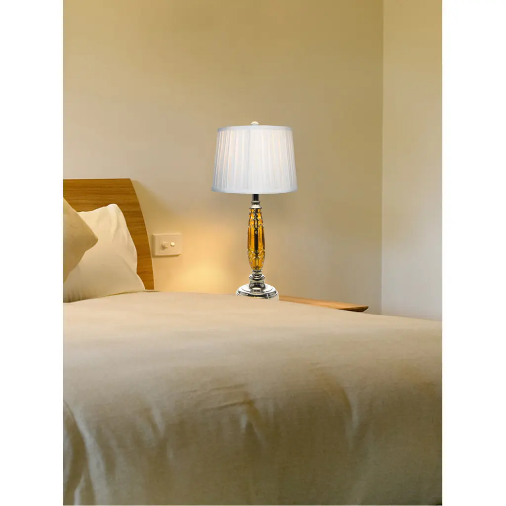 Our Glossy Amber 24% Lead Crystal Table Lamp is a contemporary twist on a classic look you will be proud to display in your home or office. The bright lamp features a metal base, finished in gleaming Polished Chrome that includes a decorative round metal pedestal atop a clear crystal base with a matching vase cap. The center column is encased in an elongated teardrop that is crafted of hand cut 24% lead crystal in a warm golden amber that features a finely cast pattern at its top and bottom. We topped the lamp with an elegantly pleated drum shade in crisp white fabric that will direct the lamplight downward over the crystal to cast a warm, shimmery glow outward into your room. The fixture is wired to accept a 150W 3-way bulb (bulb not included) to provide you with maximum light and sparkle. A great reading lamp when placed near a comfortable chair or sofa, our Glossy Amber 24% Lead Crystal Table Lamp also makes a dramatic presentation when displayed in multiples on matching end tables or nightstands.