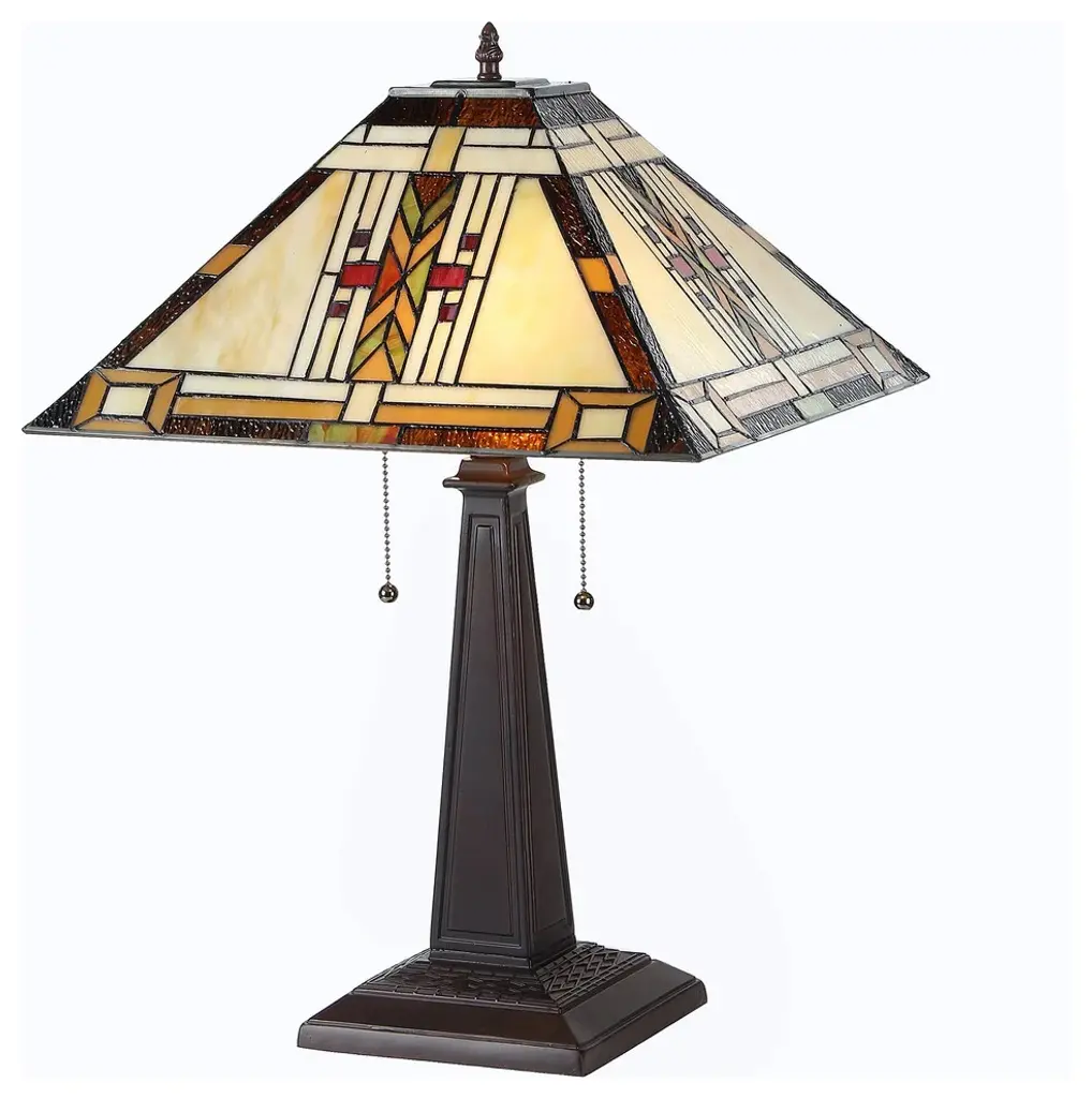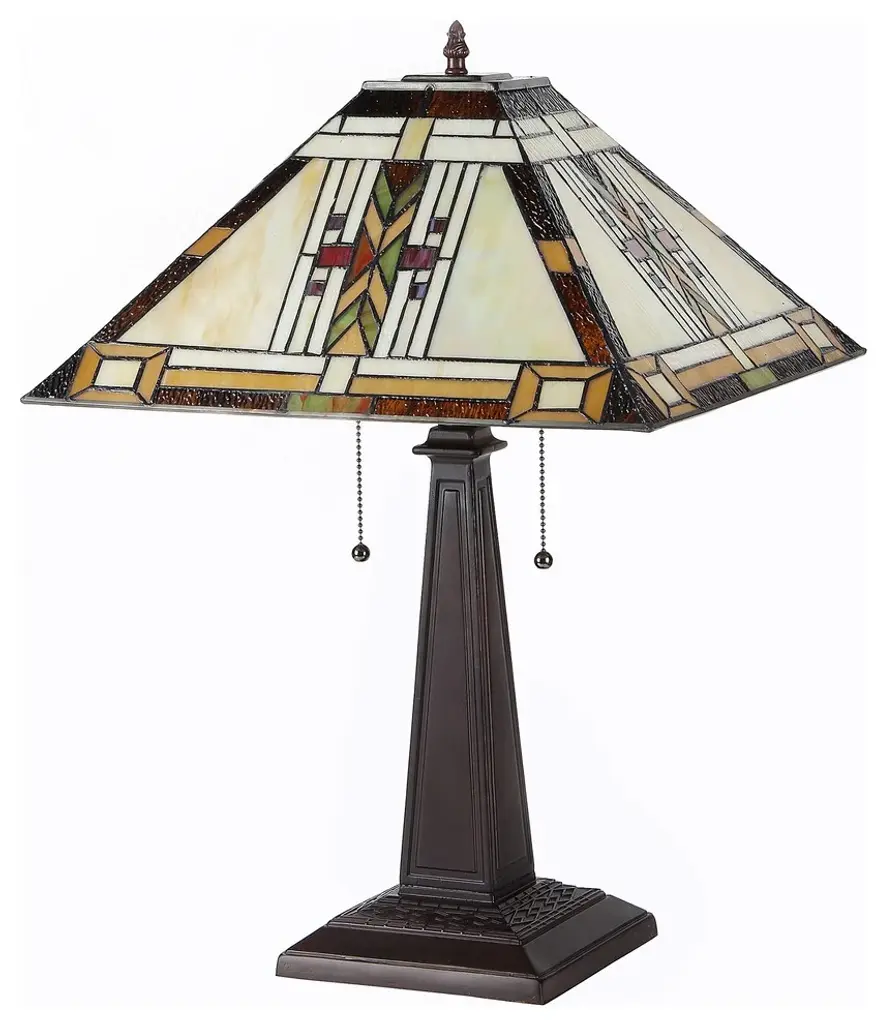 GODE, a beautiful Mission style table lamp featuring a colorful mosaic of real stained glass, will be a welcome addition to home or office. The distinctive design, handcrafted using quality materials, will become the focal point. The resin base is has a dark antique bronze finish.(2) 100 Watt max E26 Type A Bulb (not included)Pull chain switch284 pcs glass cutDownlightIndoor SettingHarmonized code: 940520Since these are hand crafted products, the exact color of glass pieces may vary. Colors of the glass will appear darker and less vibrant when not illuminated. Handmade glass will vary from one piece to the other; glass made at different times will also vary. Light bulbs used in lamps or ambient lighting may affect the appearance of the products. Stained glass product has been protected with mineral oil as part of the finishing process. Please use a soft dry cloth to remove any excess oil.