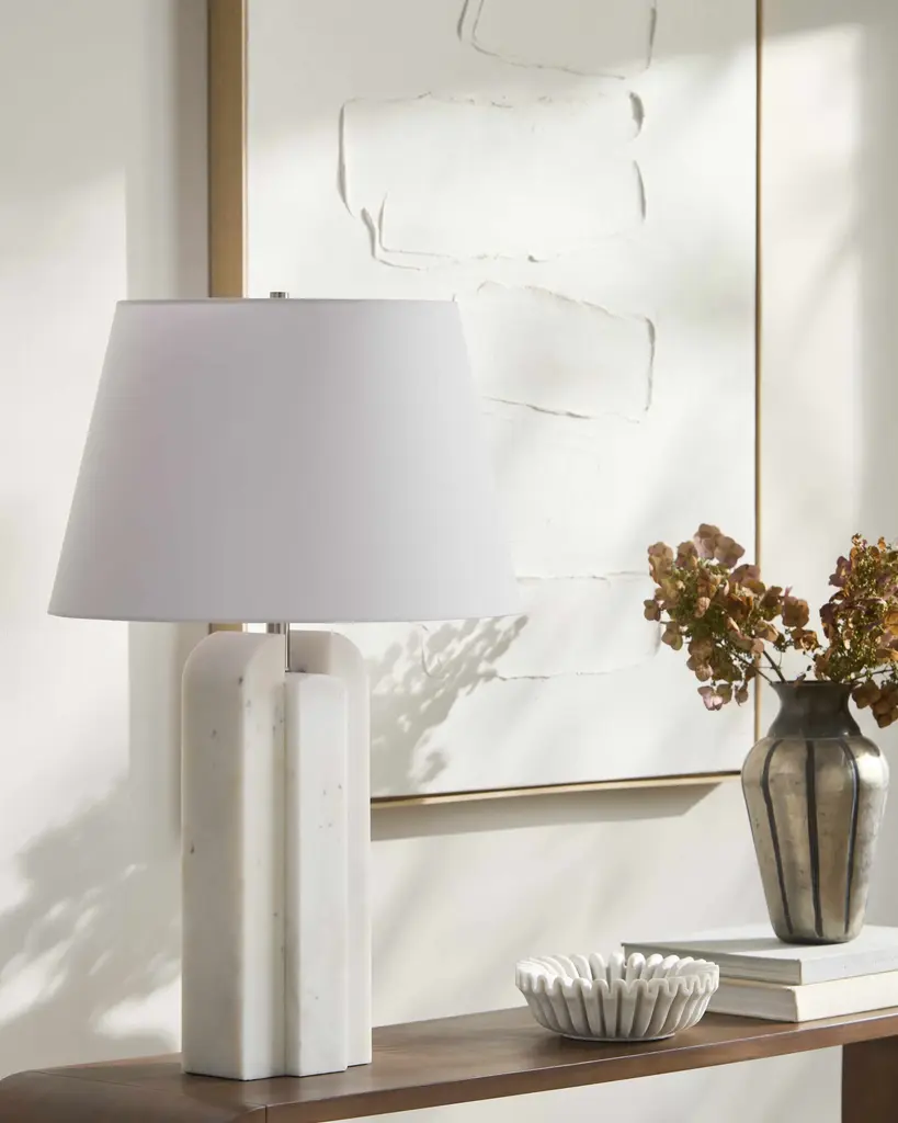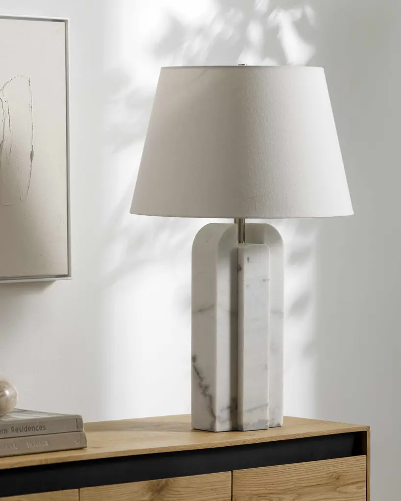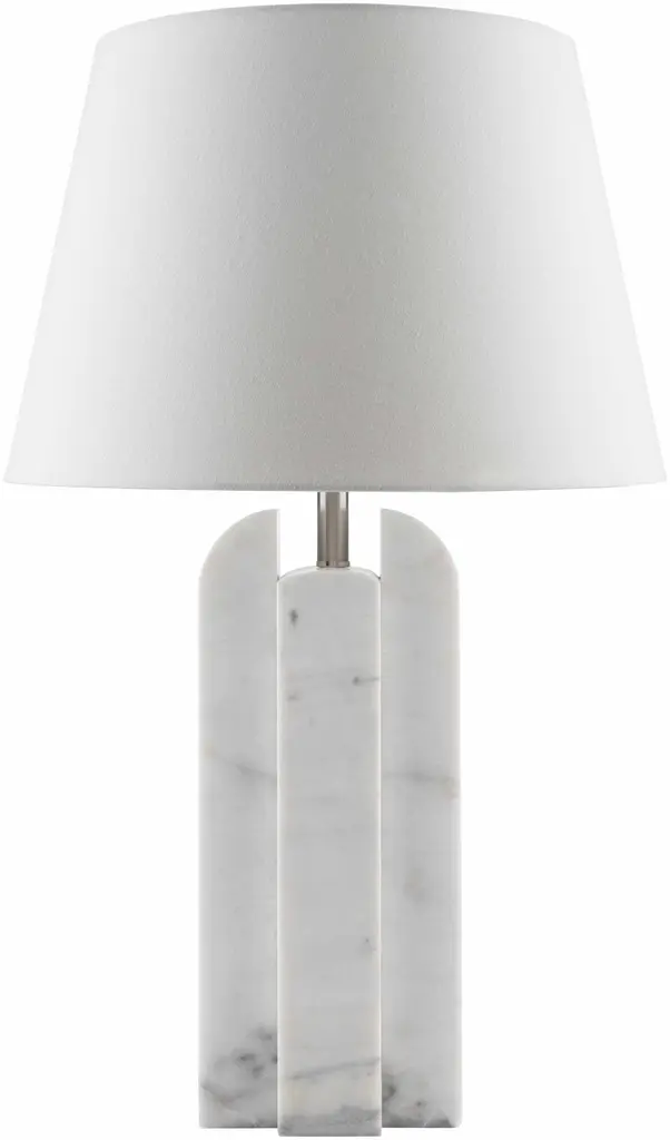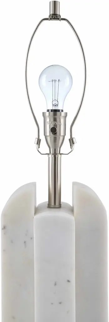 Collection: Goicoechea Colors: White, Metallic - Nickel, Translucent Material: Body: Marble / Shade (Outside): Linen / Shade (Inside): Polyester / Finial: Iron Styles: Contemporary Made In: China Lighting Type: Accent Table Lighting Shade Material: Linen, Polyester Shade Color: White, White Cord Length: 6' Switch Type: On/Off Number of Bulbs: 1 Socket Type: E-26 Bulb Wattage: 100W