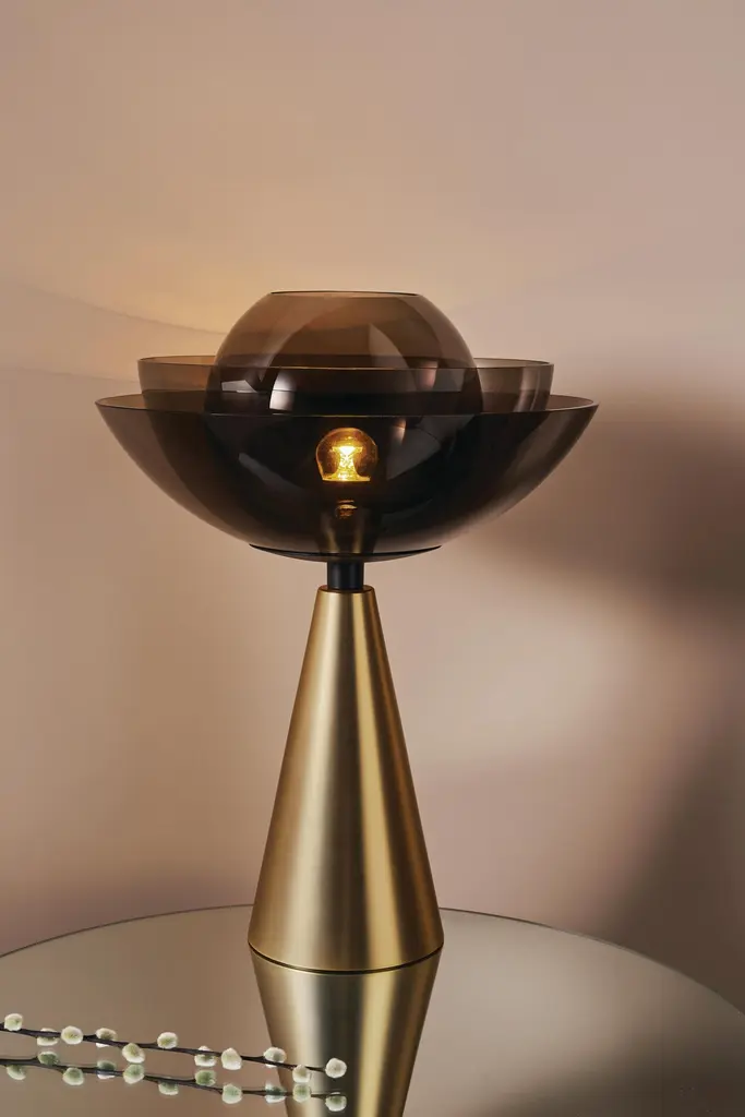 Gold lotus table lamp by Mason EditionsDimensions: 36 × 48 cmMaterials: matte gold 24k base + transparent smoke grey blown glassFinishings: matte gold 24k base + transparent smoke grey blown glasspolished champagne gold base + transparent opal blown glassmatte copper base + transparent opal blown glassmatte white nickel base + transparent blown glassAll our lamps can be wired according to each country.With its fascinating shape and heady scent, for many Asian cultures the lotus flower symbolizes elegance, beauty and grace. The support of this magical flower is a cone in enameled metal, which narrows upwards to embrace the luminous core. Like a bud that opens in the sunlight, Lotus unfolds its blow glass petals, made up of three separate elements. They gently filter the light to create an intimate and cozy atmosphere.Ideal for bedside, desk and table use, this modern design lamp is an exquisite example of aesthetics combined with functionality.Mason Editions is an Italian company specialized in the production of design furniture, lighting solutions, and accent pieces. Born from the lifelong passion for lighting and entrepreneurial spirit of Fabio and his partner Silvia, Mason Editions places itself halfway between fine art and exquisite craftsmanship. A collection of lighting, design objects, and furnishing accessories, signed by artists Serena Confalonieri, Martina Bartoli, and Matteo Fiorini, head of the creative direction. Mason Editions comes from the experience of an Italian lighting company placed in the Veneto region. This new brand of furniture elements was born from the meeting between the entrepreneur Fabio Mason and three international designers who designed the first collection for a sophisticated public. Therefore the collection wants to be eclectic and timeless.The Material contrast and fresh design, with essential shapes, mark the mason editions collection.In conclusion, the elegant Italian sign highlights proposals suitable for all environments.Mason editions is a set of experiences, artisans, and productive know-how that creates a capable system.