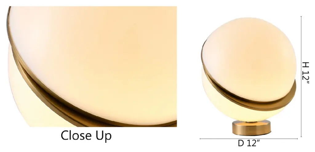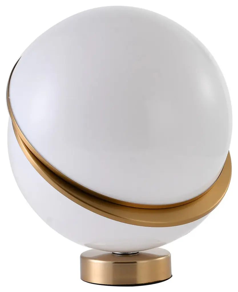 This modern and stylish table lamp features a unique orb-shaped design with a gold metal base and a white glass shade. The minimalist design creates a dramatic and eye-catching effect, perfect for adding a touch of contemporary flair to a bedside table, living room, or home office. This table lamp is a plug in with an ON/OFF switch. Color: GoldSize: D12" H12"Materials: MetalLighting Specs:Commercial Use: YesUL Certified: YesETL Certification: NoLight bulbs not includedNumber of Bulbs: 1Bulb Type: E26Max Wattage: 60