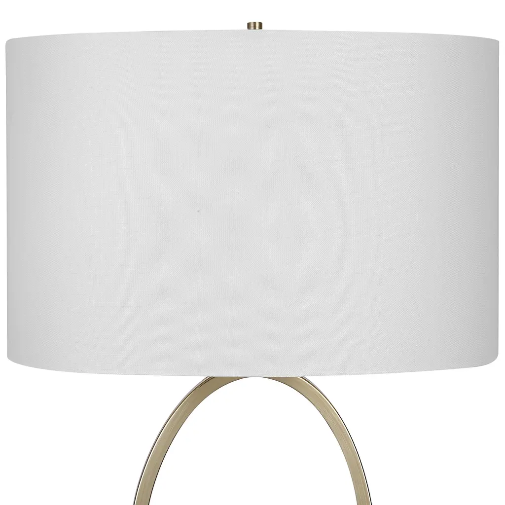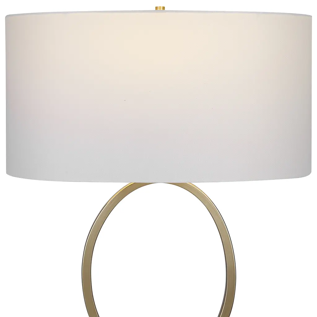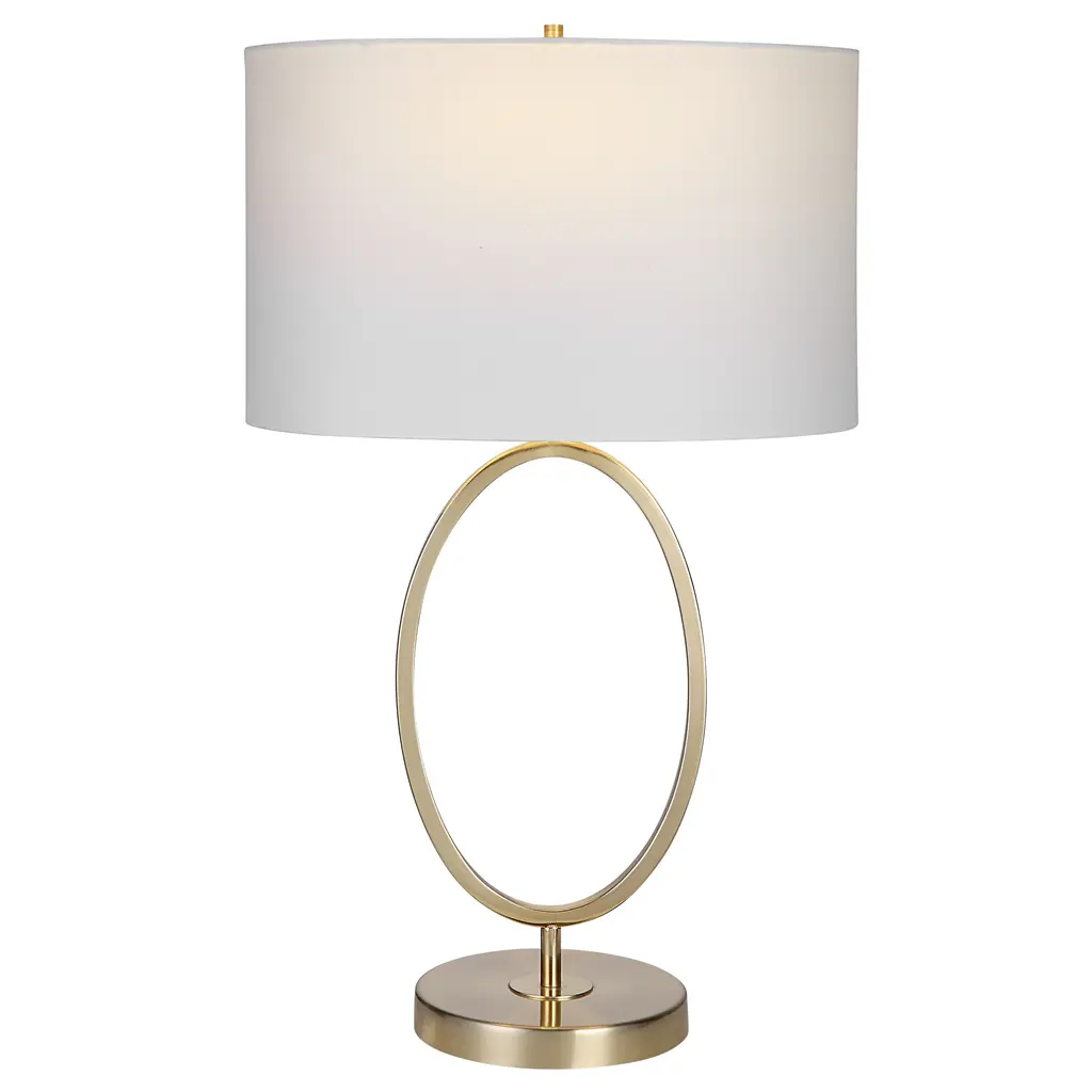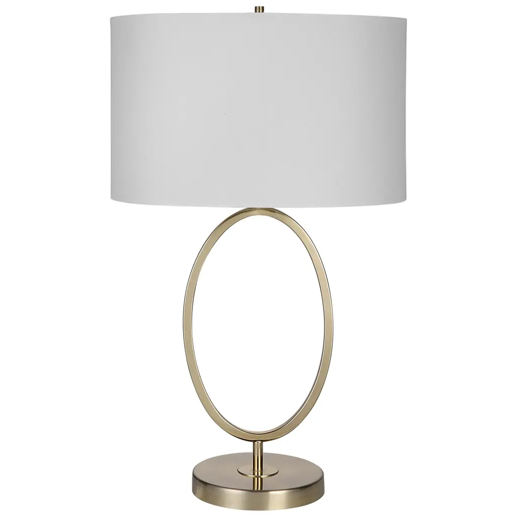 An oval center ring gives a feeling of openness to this unique table lamp. The metal base features a golden brass finish. It is paired with an oval hardback white linen shade. Features: Set includes: One (1) table lamp Materials: Metal, fabric Finish: Golden brass Shade color: White Voltage: 110V Wattage: 150W Bulb quantity: 1 Number of light: 1 Shade description: Oval hardback shade Dimensions: Table lamp: 26.5 inches high x 16 inches wide x 11 inches deep Shade: (16x11) inches top x (16x11) inches bottom x 10 inches high This product will ship to you in one (1) box. Accessories pictured are NOT included. WARNING: WARNING: This product can expose you to chemicals including nickel which is known to the State of California to cause cancer. For more information, go to www.P65Warnings.ca.gov/furniture.