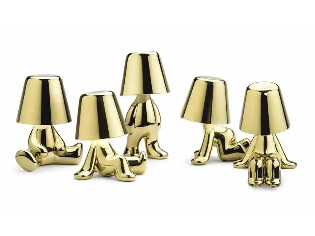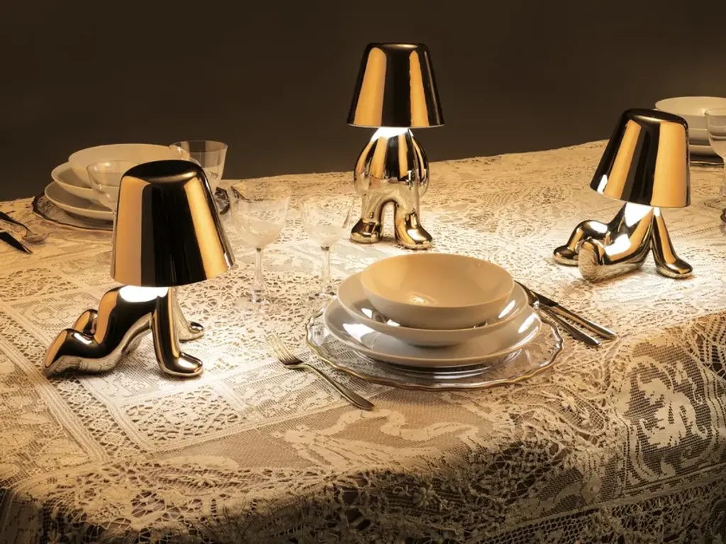 Designed by Stefano Giovannoni, Golden Brothers is a family of lamp characters which, reflecting a soft light on their body, enhance the plasticity and fluidity of the silhouette.The Golden Brothers, assuming different postures, create an animated landscape and, due to their abstract-figurative approach, they are the perfect detail that can characterize the table and personalize every corner of the house.This family of rechargeable battery-operated LED lamps is equipped with a soft touch switch.