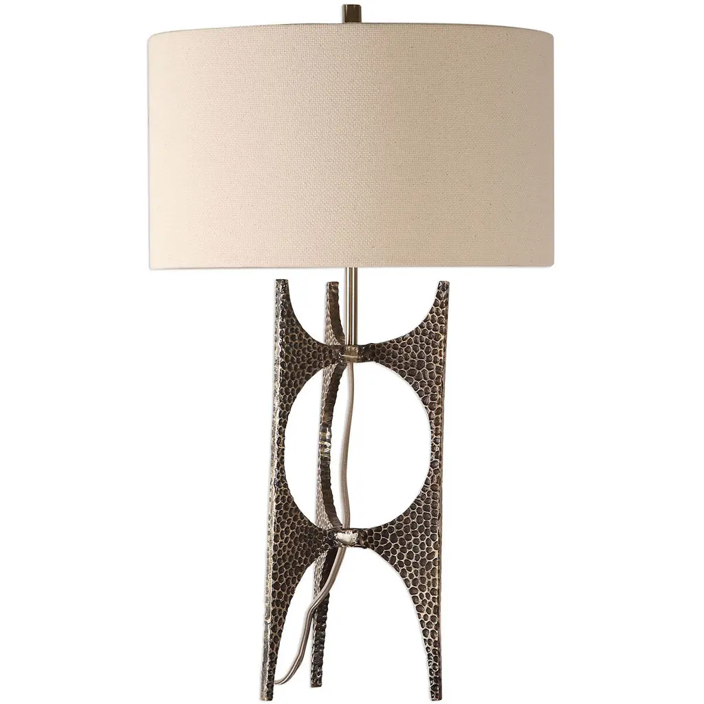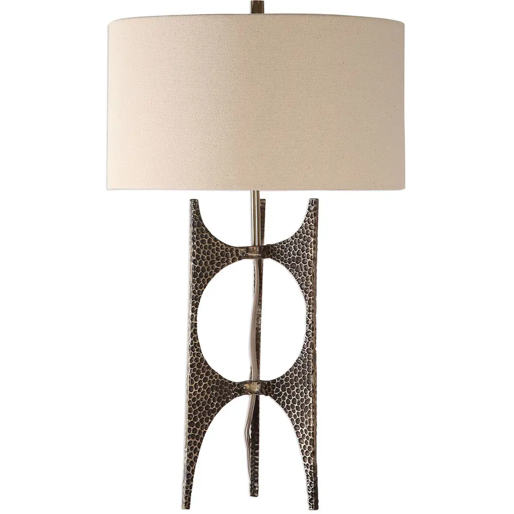 This Contemporary Design Is Formed From Cast Iron Featuring A Deep Hammered Texture, Finished In A Heavily Antique Golden Bronze, Paired With An Exposed Fabric Covered Cord. The Round Hardback Drum Shade Is White Linen Fabric.