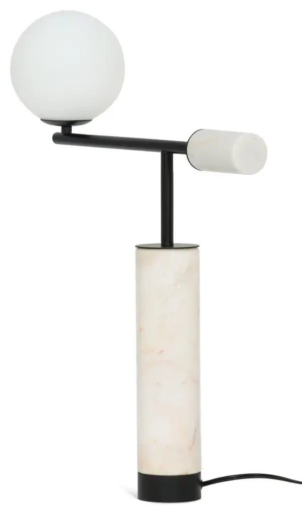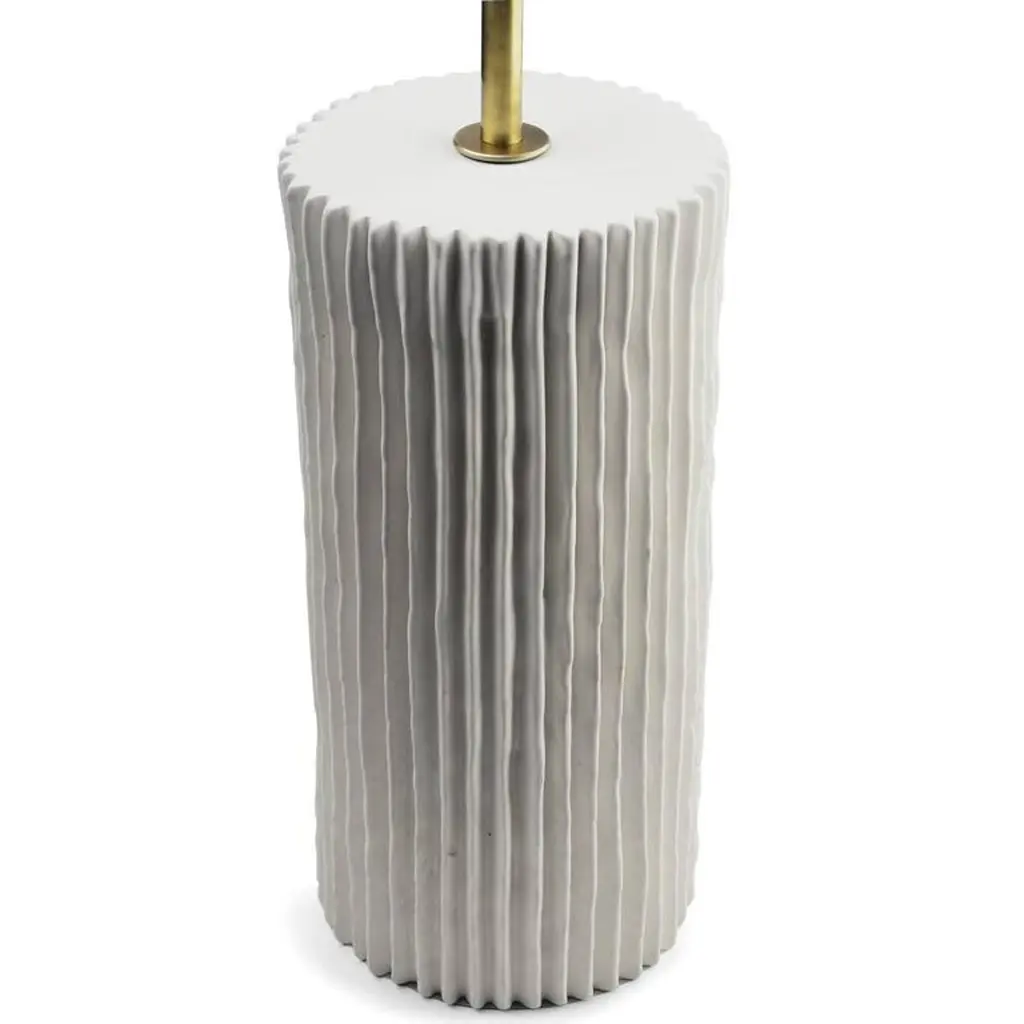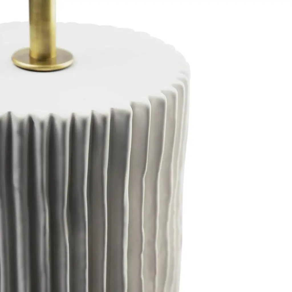 The base of this elegant lamp is a cylinder in white ceramic whose surface is decorated with ridges throughout. The body is in brass with a cylindrical diffusor that features a decoration of vertical ridges as well.