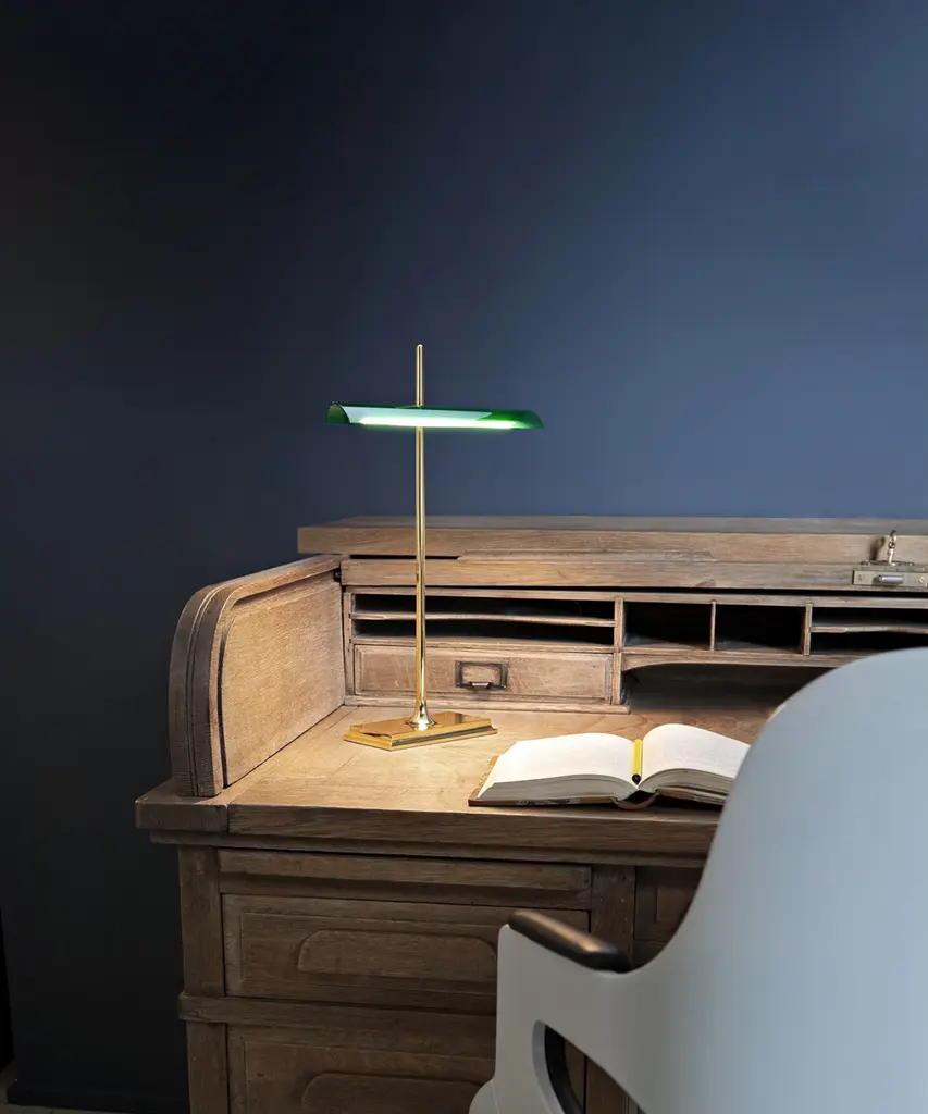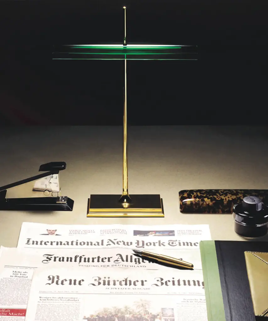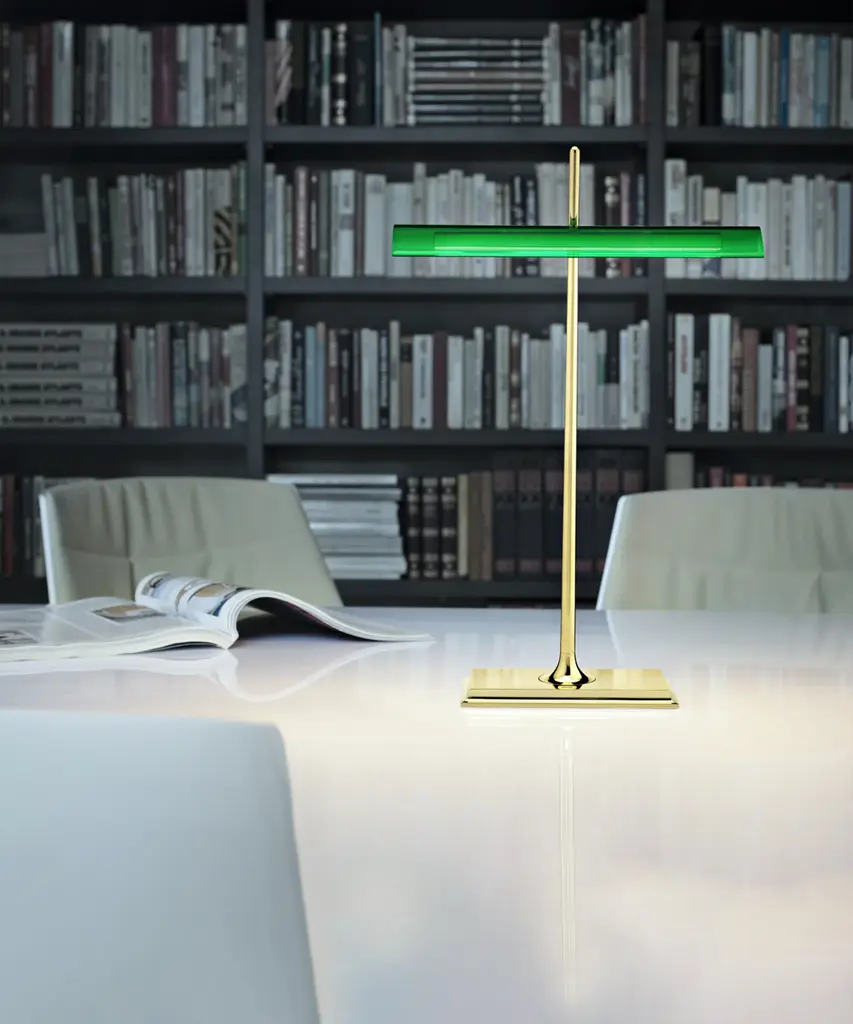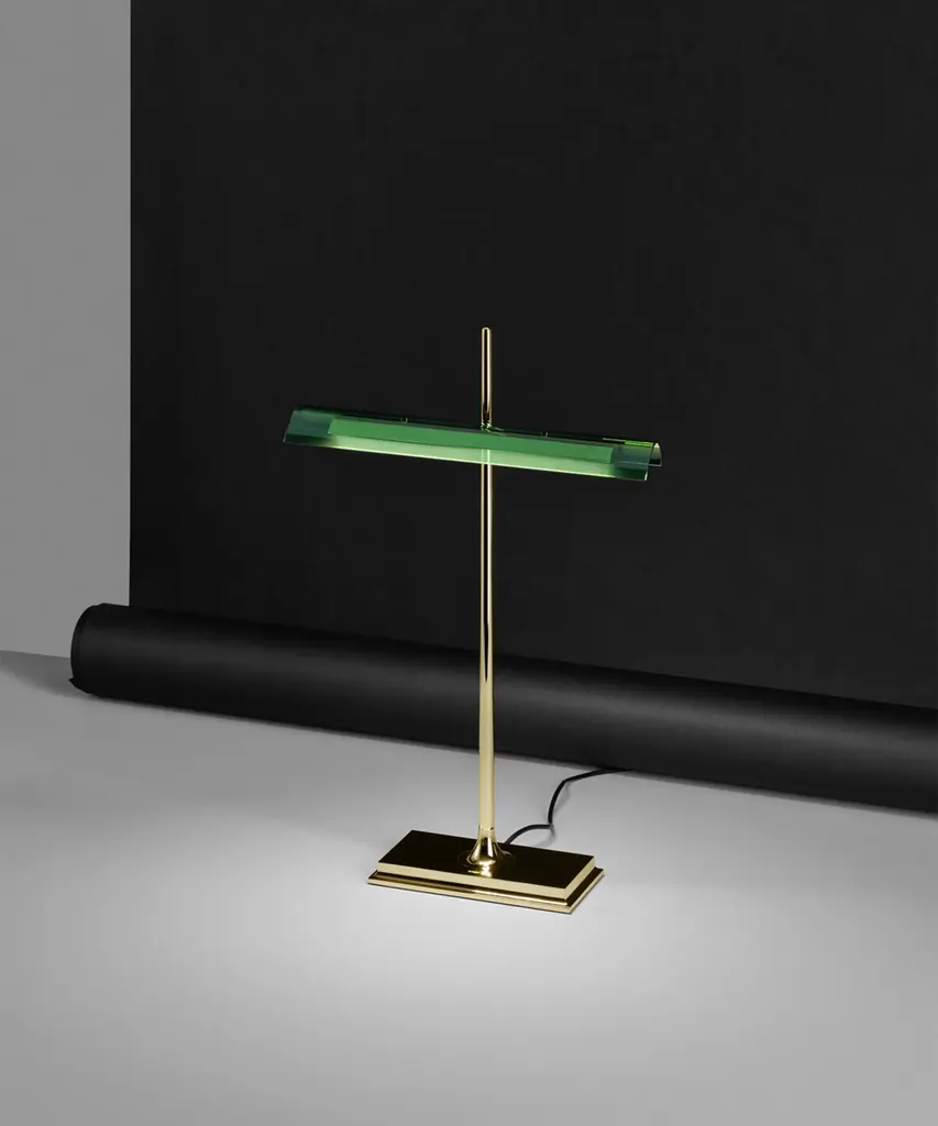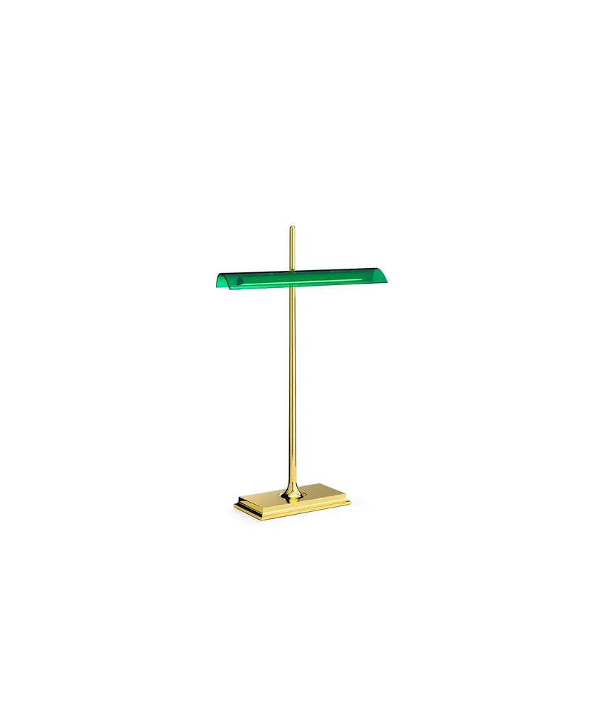 This well-known design gets a technological twist thanks to artist Ron Gilad, who created the Goldman to feature diffusers made of clear methacrylate and an aluminum frame. There is a USB plug built into the base, as well as an optical switch that is dimmable and features Soft Touch technology. The power supply is on a plug with interchangeable sockets. The inspiration behind the design: Inspired by the legendary "banker's lamp," Ron Gilad recreated the spirit of this style through the use of innovative and modern materials. This authentic design is produced in Italy exclusively by Flos.