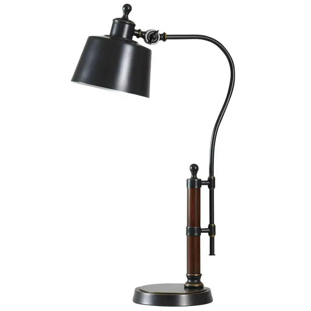 The Goodman Table Lamp by Visual Comfort Signature, formerly known as Visual Comfort, will help light any space with style and grace. Featuring a metal shade that directs all of the lamp’s output in the direction you desire, this fixture will be a welcomed addition to any table or desk where activity takes place. Adjustable at the head and where the arm meets the stem for further control. Exaggerated on/off switch and counterweight, along with detailed accents throughout, complete this piece.