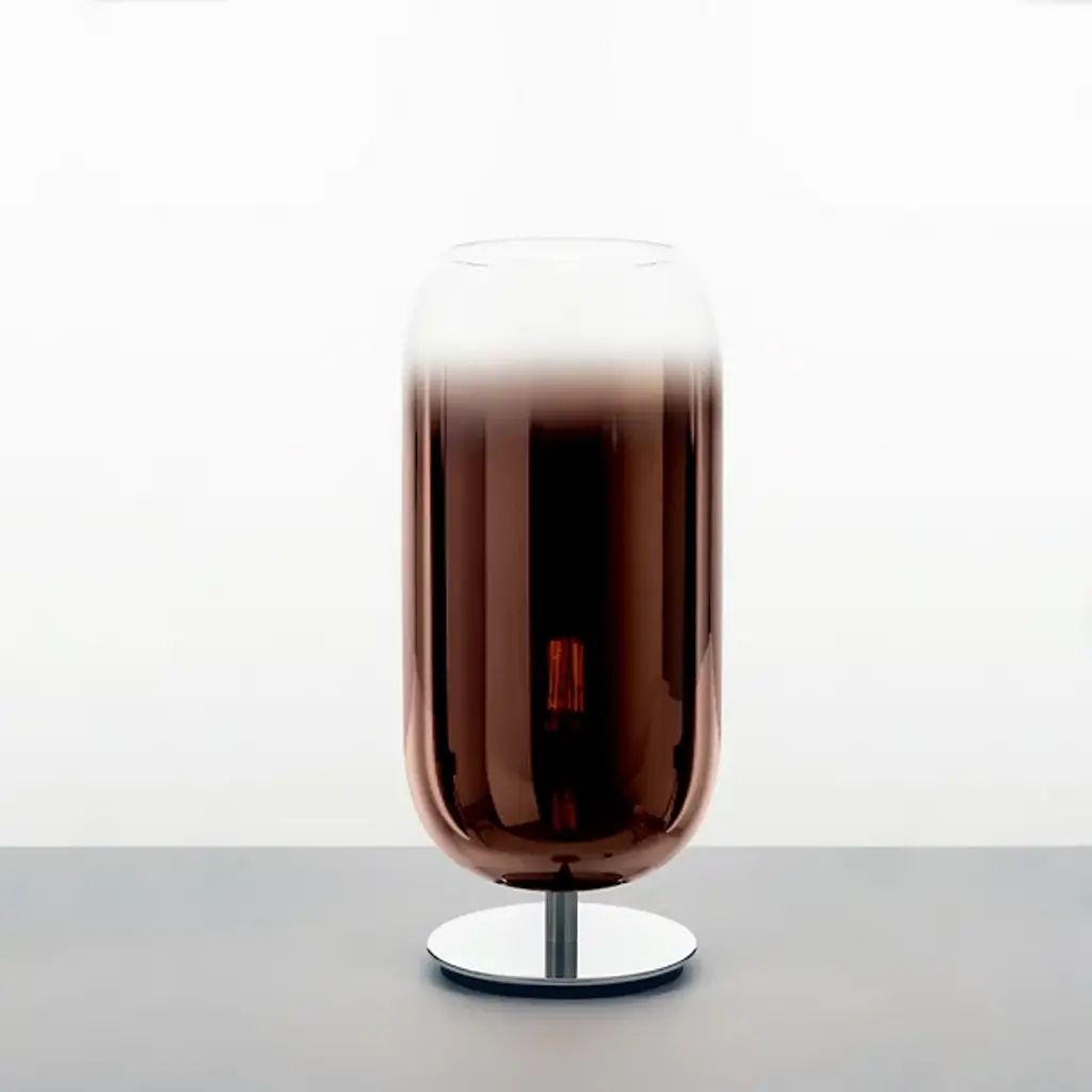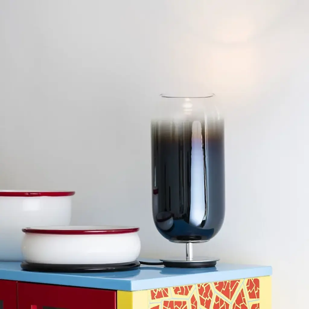 A delight for the senses, created by Bjarke Ingels Group for the wellness of man. The Gople Mini Table Lamp from Artemide is a shape of delightful energy living gracefully over one's table surfaces. Glassblowers in Murano, Venice craft each sumptuous pill-shaped shade in a glass-blowing process dating back centuries. Its shifting opaque surface mellows light in a soothing ambient glow. A handsome metal base adds a surge of sharpness as its polished, sleek edges juxtapose with the roundness of the glass.
