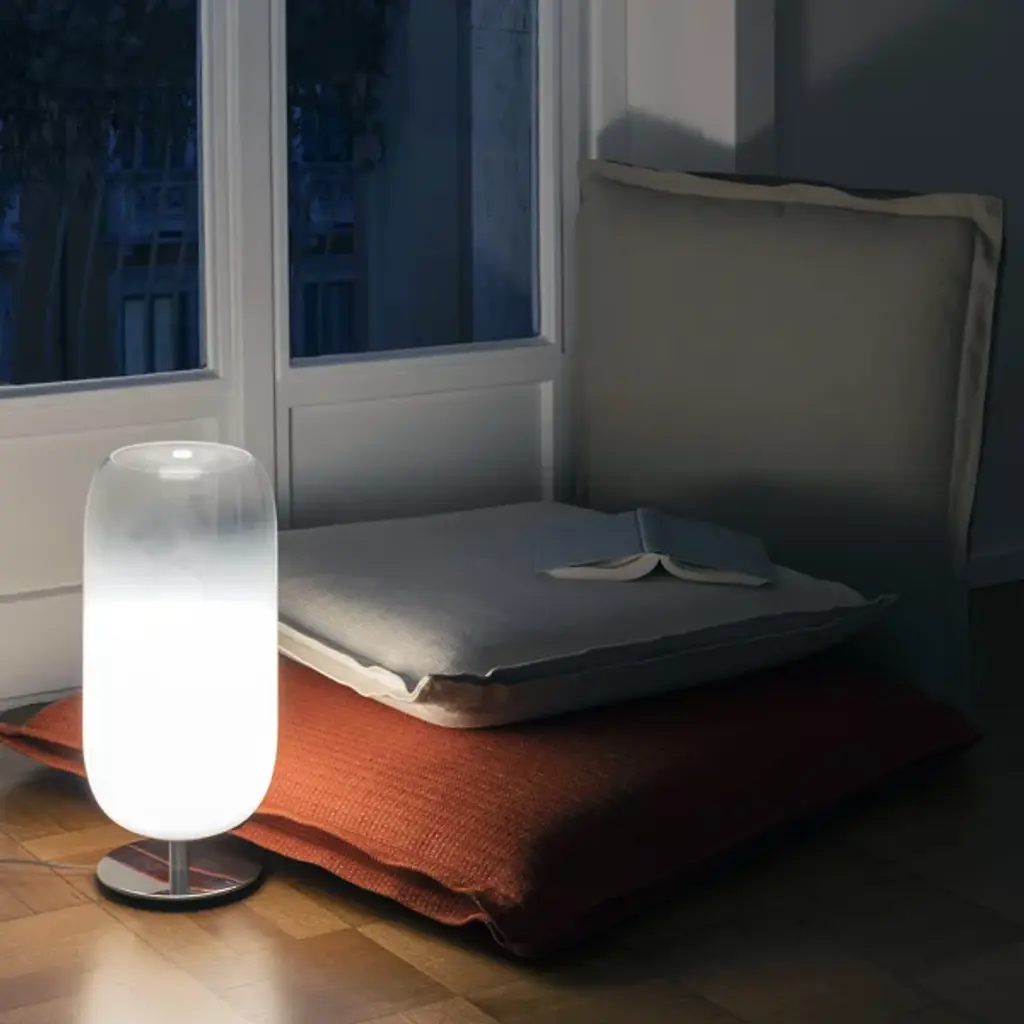 A design by Bjarke Ingels Group, setting atop any table surface with a rich, captivating figure. Hand-blown glass and light come together to create an ambiance tailored for the human experience in the Gople Table Lamp from Artemide. A circular metal base graces a tabletop in an elegant hint of polish. Stunning at any time of day, hand-blown Murano glass shaped into a pill-like form balanced gracefully atop a slender column. An LED bulb inside creates a gradient of vibrancy across the glass enclosure, translating into an ambient glow.