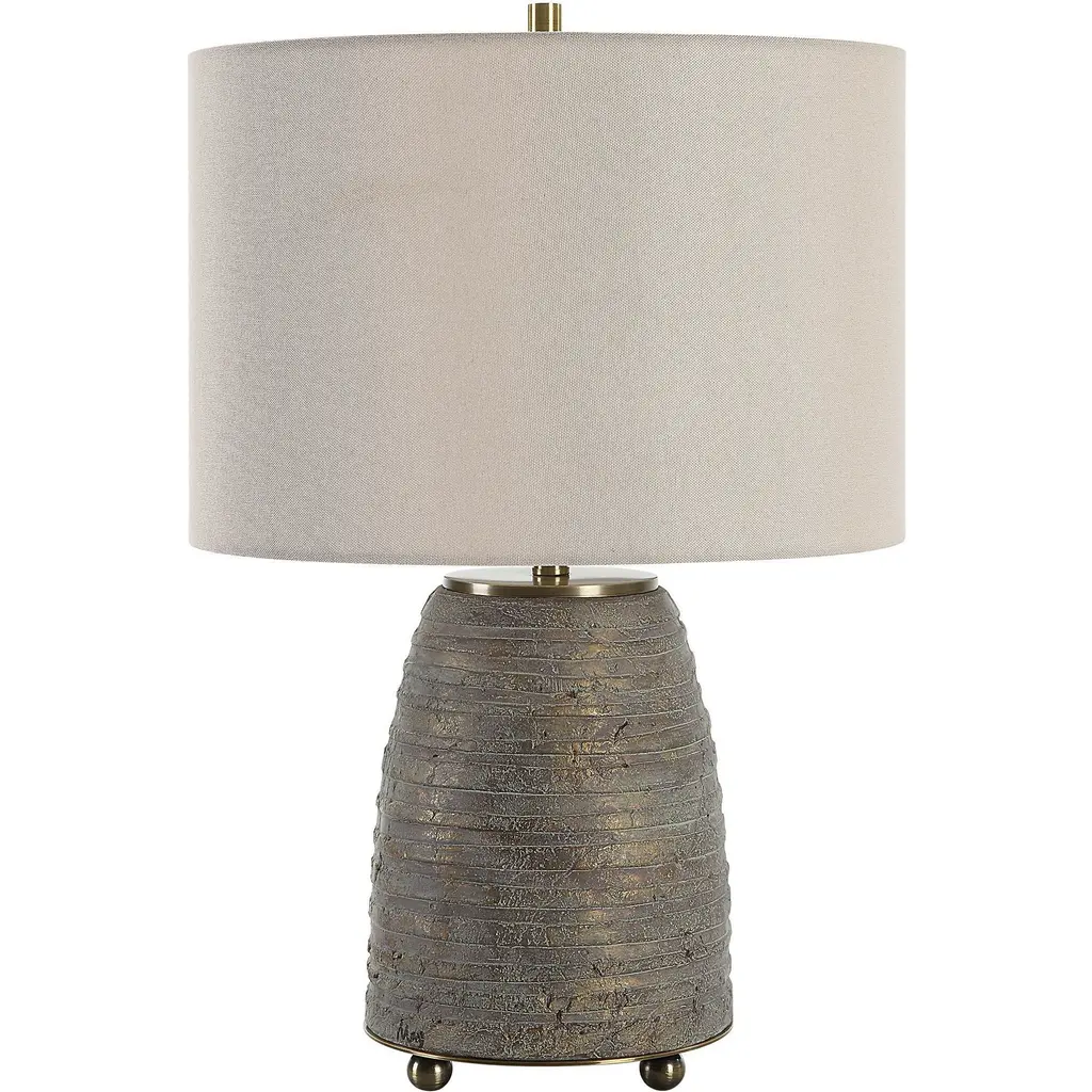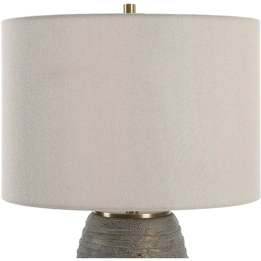 Rustic Meets Sophisticated With The Gorda Lamp. Featuring Heavily Textured Bronze Ceramic With A Green Patina Overlay Accented With Plated Brushed Antiqued Brass Details. The Round Drum Hardback Shade Is A Beige Linen Fabric. Due To The Nature Of Fired Glazes On Ceramic Lamps, Finishes Will Vary Slightly.