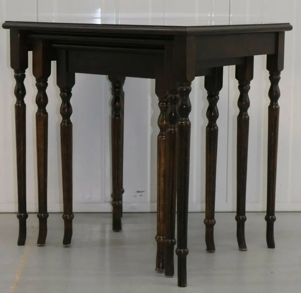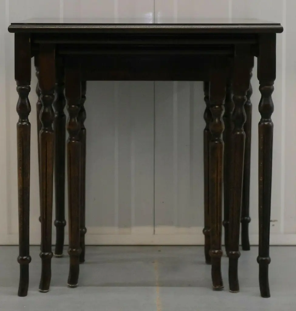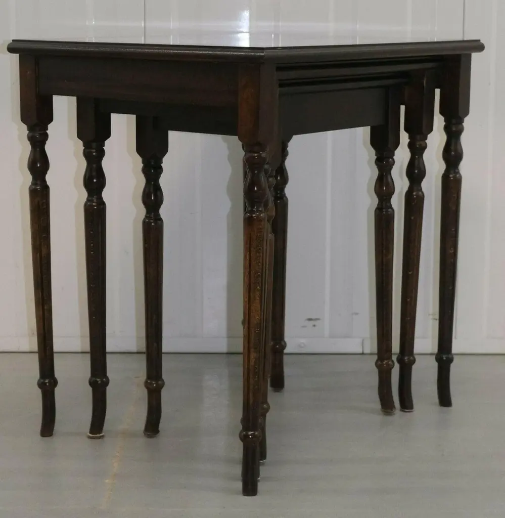 We are delighted to offer for sale this gorgeous mahogany brown nest of tables standing on beautiful fluted legs.These tables are not only very versatile but also very pretty pieces of furniture to look at. They can be used for small drinks tables when guests are in your home or simply as side or lamp tables. They have a few marks on top of them but nothing major to point out.Please have a closer look at the pictures because they form part of the description.Antique and vintage/used items will show signs of wear which form part of their character. All our items are cleaned thoroughly, then a coat of wax is applied to revive the leather/wood and finally hand polished. Dimensions (cm) Big table medium table small tableheight 52 height 50 height 47width 50,5 width 42 width 33depth 41 depth 32 depth 23,5All our measurements are taken at the widest point.