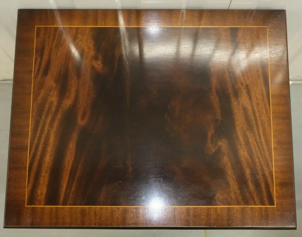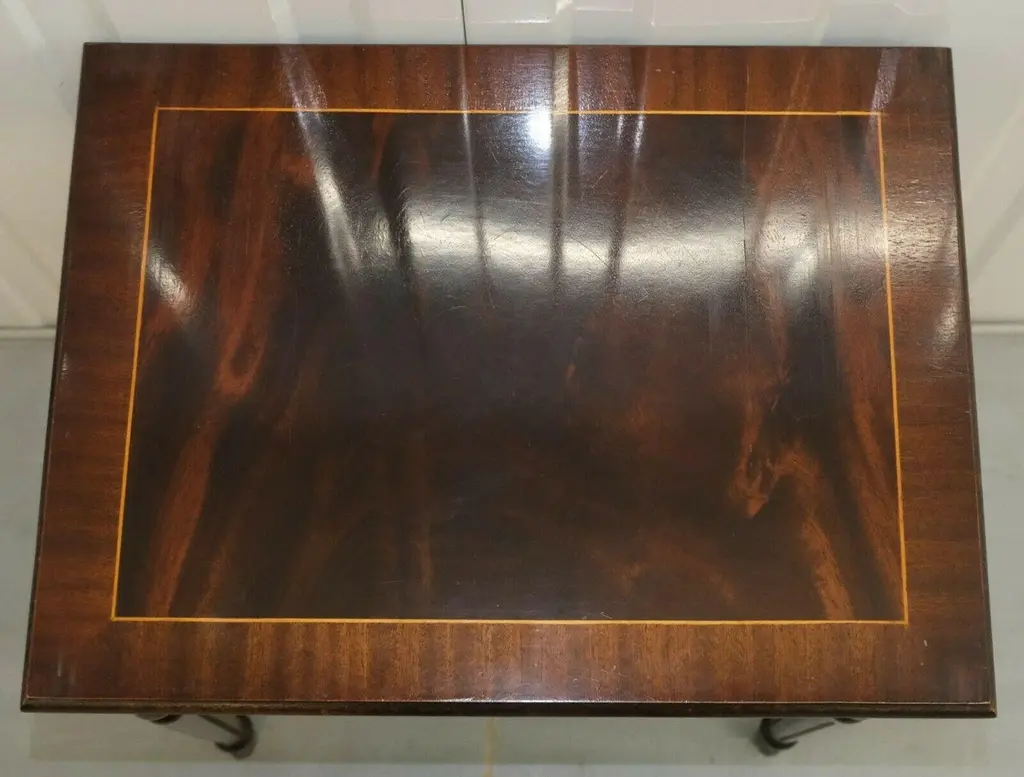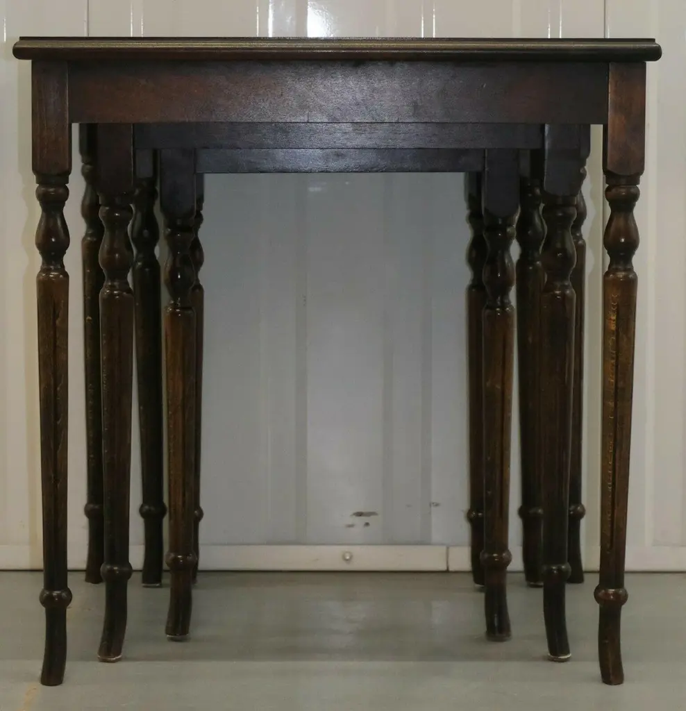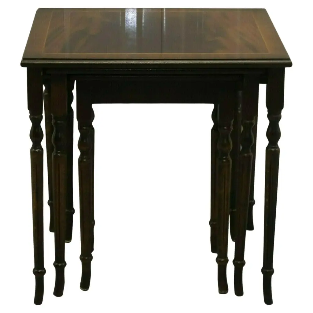 We are delighted to offer for sale this gorgeous mahogany brown nest of tables standing on beautiful fluted legs.These tables are not only very versatile but also very pretty pieces of furniture to look at. They can be used for small drinks tables when guests are in your home or simply as side or lamp tables. They have a few marks on top of them but nothing major to point out.Please have a closer look at the pictures because they form part of the description.Antique and vintage/used items will show signs of wear which form part of their character. All our items are cleaned thoroughly, then a coat of wax is applied to revive the leather/wood and finally hand polished. Dimensions (cm) Big table medium table small tableheight 52 height 50 height 47width 50,5 width 42 width 33depth 41 depth 32 depth 23,5All our measurements are taken at the widest point.