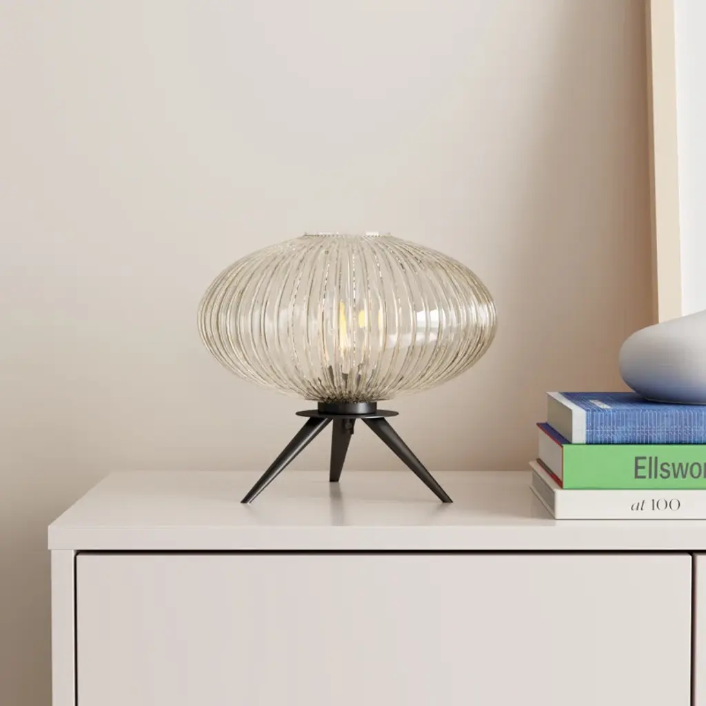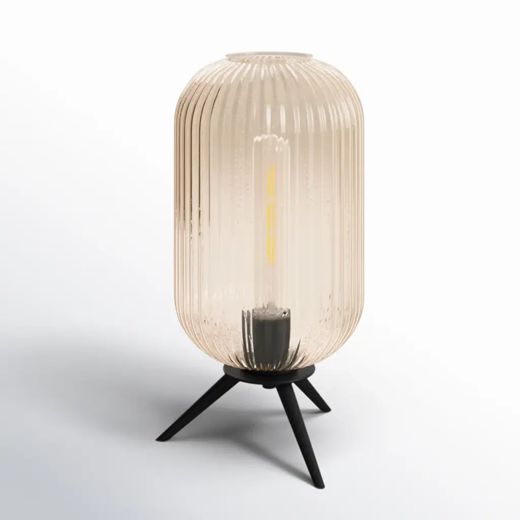 It's all about balance. This table lamp features a sleek black iron tripod base that's poised to provide illumination to your writing desk or console. Angled legs lend lots of stability, while an amber glass oval shade surrounds an included LED. The shade's oval silhouette and vertical grooves play with the light and make this a bold, mid-century piece for any location.