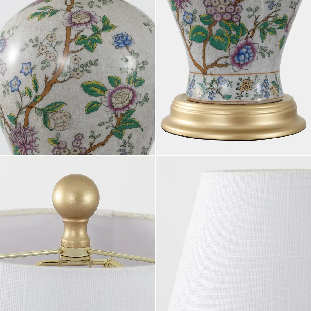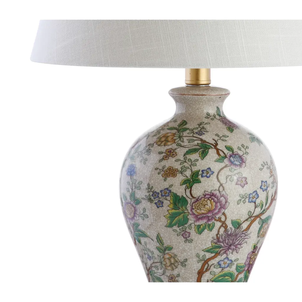 Add a touch of elegance to your traditional space with the Grace 24" Floral LED Table Lamp by JONATHAN Y. This urn-shaped lamp base is adorned with hand-painted florals in pastel shades, evoking the time-honored tradition of European porcelain at an affordable price point. The lamp is embellished with brass accents and a silk-wrapped cord in the back. The 100% cotton hardback tapered empire shade casts a warm and inviting glow, while the included eco-friendly 9W LED bulb makes it easy on both the environment and your wallet.Features:Dimensions:About us: