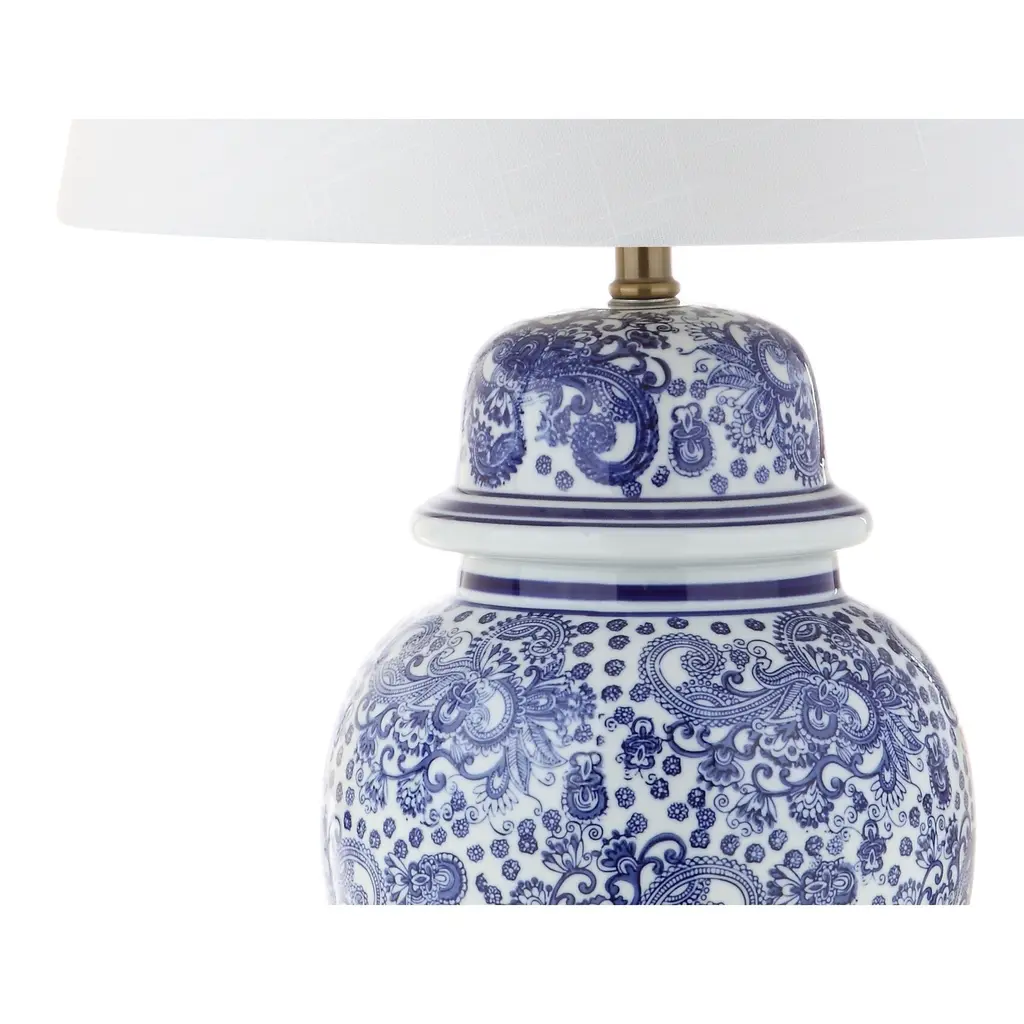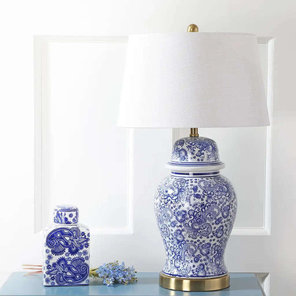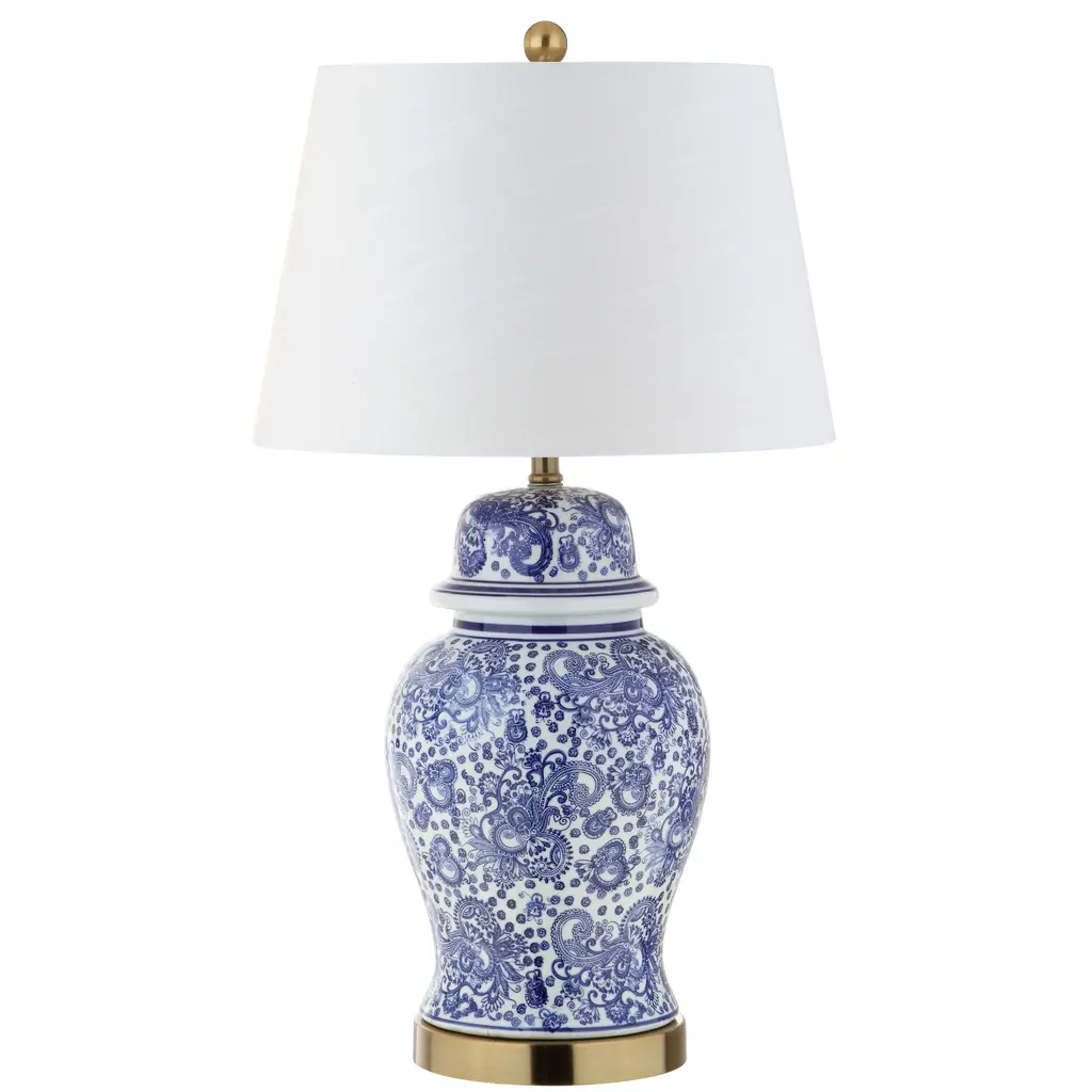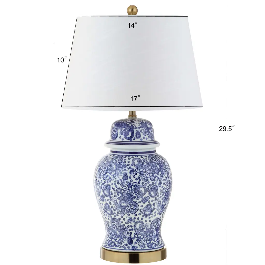 Bring some traditional elegance to your space with the Grace 29.5" Ceramic LED Table Lamp by JONATHAN Y. This hand-painted ginger jar lamp features a blue and white color scheme with antiqued brass ornamentation. The linen hardback drum shade adds a touch of grandeur to the classic design. With an eco-friendly LED bulb included, an on-off switch on the socket, and a silk-wrapped cord in the back, this lamp is both functional and stylish.Features:Dimensions:About us: