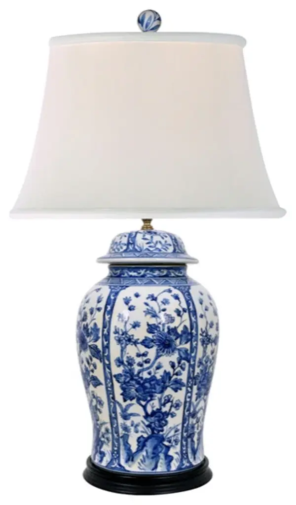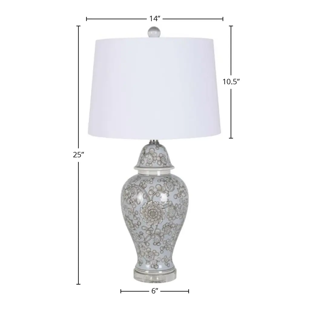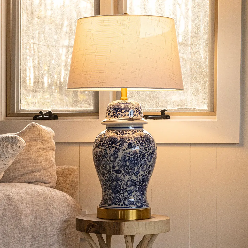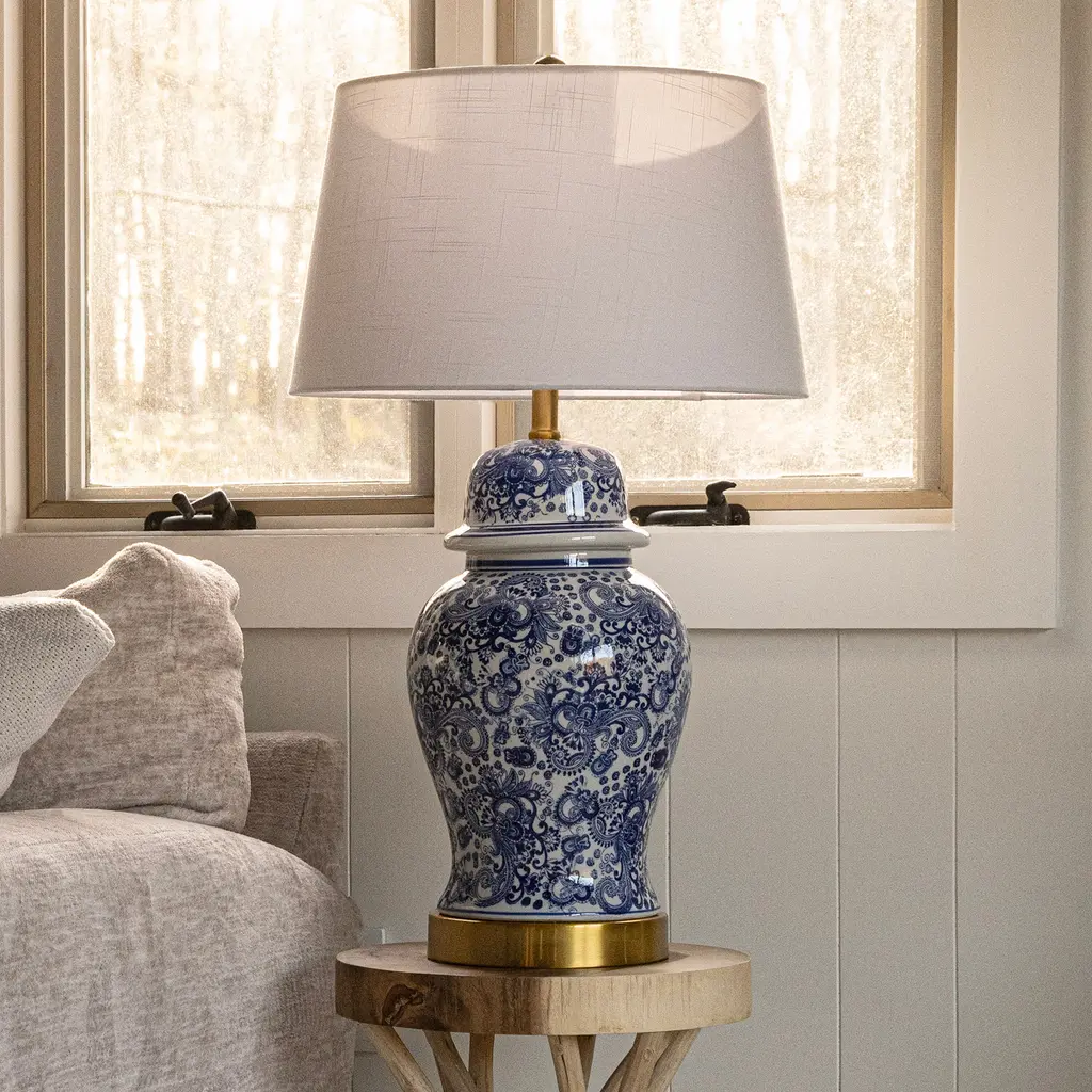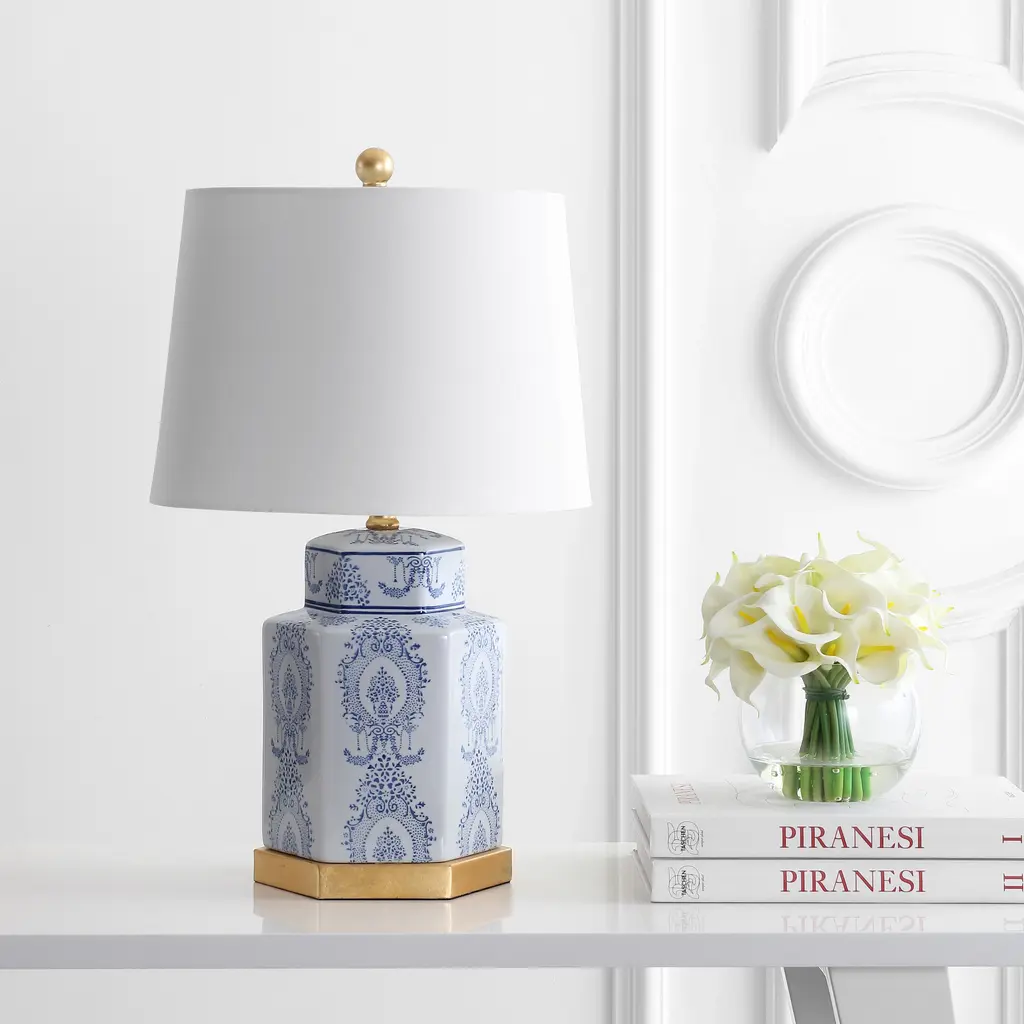 Bring some traditional elegance to your space with the Grace 29.5" Ceramic LED Table Lamp by JONATHAN Y. This hand-painted ginger jar lamp features a blue and white color scheme with antiqued brass ornamentation. The linen hardback drum shade adds a touch of grandeur to the classic design. With an eco-friendly LED bulb included, an on-off switch on the socket, and a silk-wrapped cord in the back, this lamp is both functional and stylish.Features:Dimensions:About us: