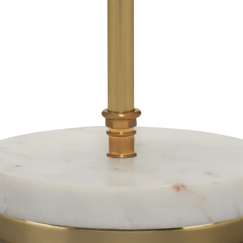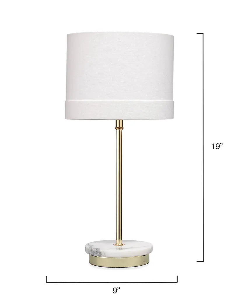 A graceful contemporary lamp with a marble and brass base that give it glamour and dimension, paired with a drum cotton shade with bold bottom band makes for the perfect modern accent lamp. Material: Marble Material Type: Marble & Iron Color: White Finish: White Marble & Antique Brass Metal Dimensions As Shown: 19.5"h x 9"dia Lamp Dimensions: 5.5"dia x 12"h Shade Name: Drum Shade Shade Fabric: White Linen Shade Dimensions:9" top dia./ 9" bottom dia./ 7"h Collection Code: COL11 Style: Modern Cord Color: Clear Number of Bulbs: 1 Watts40: watts Socket Type: Medium Base (E-26) Switch Type: 1-way