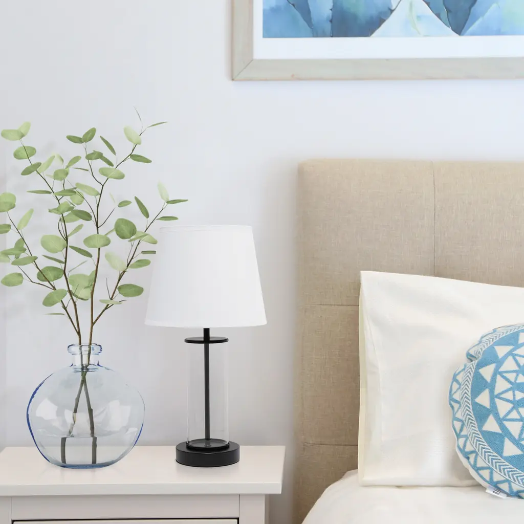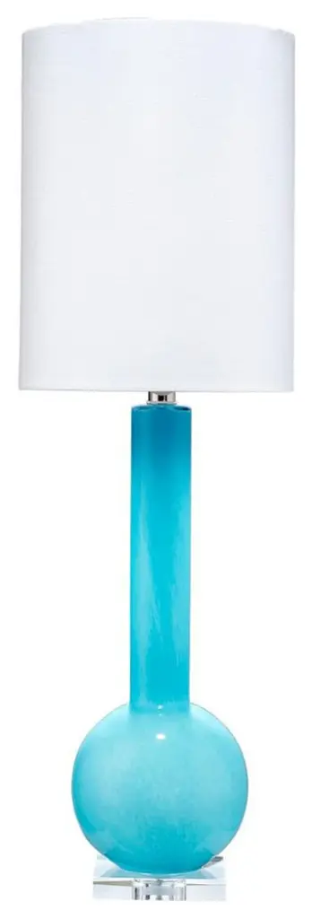 A quietly modern glass lamp in a graceful bright blue glass. The tall thin drum shade is white linen. Available in 4 beautiful colors.10"W x 10"D x 32.5"H. Weighs 6 lbs.Hand Finished Art Glass. Linen Fabric ShadeUL listed. Uses one max 60W Type A bulb (not included). On/off socket switch.Heirloom Quality - Expertly hand crafted and hand finished. Due to the hand crafted nature of this piece, each piece may have subtle differences.