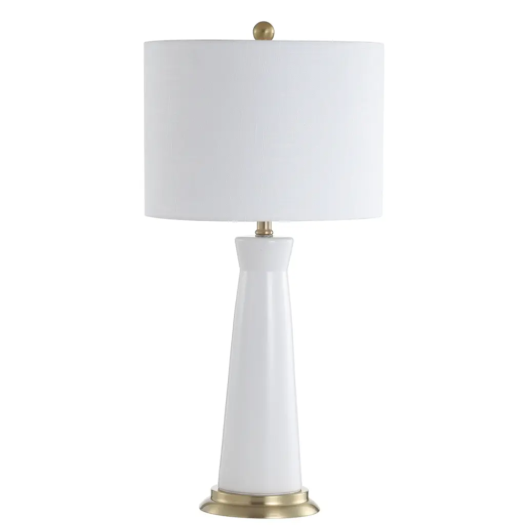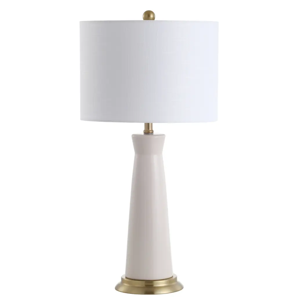 Resting on an elegant brass base, this tapered column table lamp features a soft rose glaze. Ceramic construction perfectly complements a, oblong hourglass silhouette to bring eye-catching flair. A linen tapered drum shade and silk-wrapped cord complete the look.Features:Dimensions:About us:You see a lamp.We see a decorative work of art.A perfectly curved shade casts a dramatic shadow on a floor. A silk cord you never want to hide. LED lightbulbs: as easy on the environment as they are on the eyes. The JONATHAN Y Lighting collection considers every detail from impeccably sourced materials to designer styling. And our prices are so attractive, we've transformed a functional necessity into a fashion accessory.JONATHAN Y Lighting - a fashion revolution in home decor.