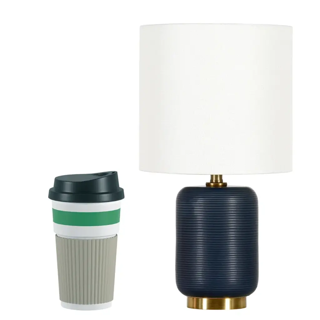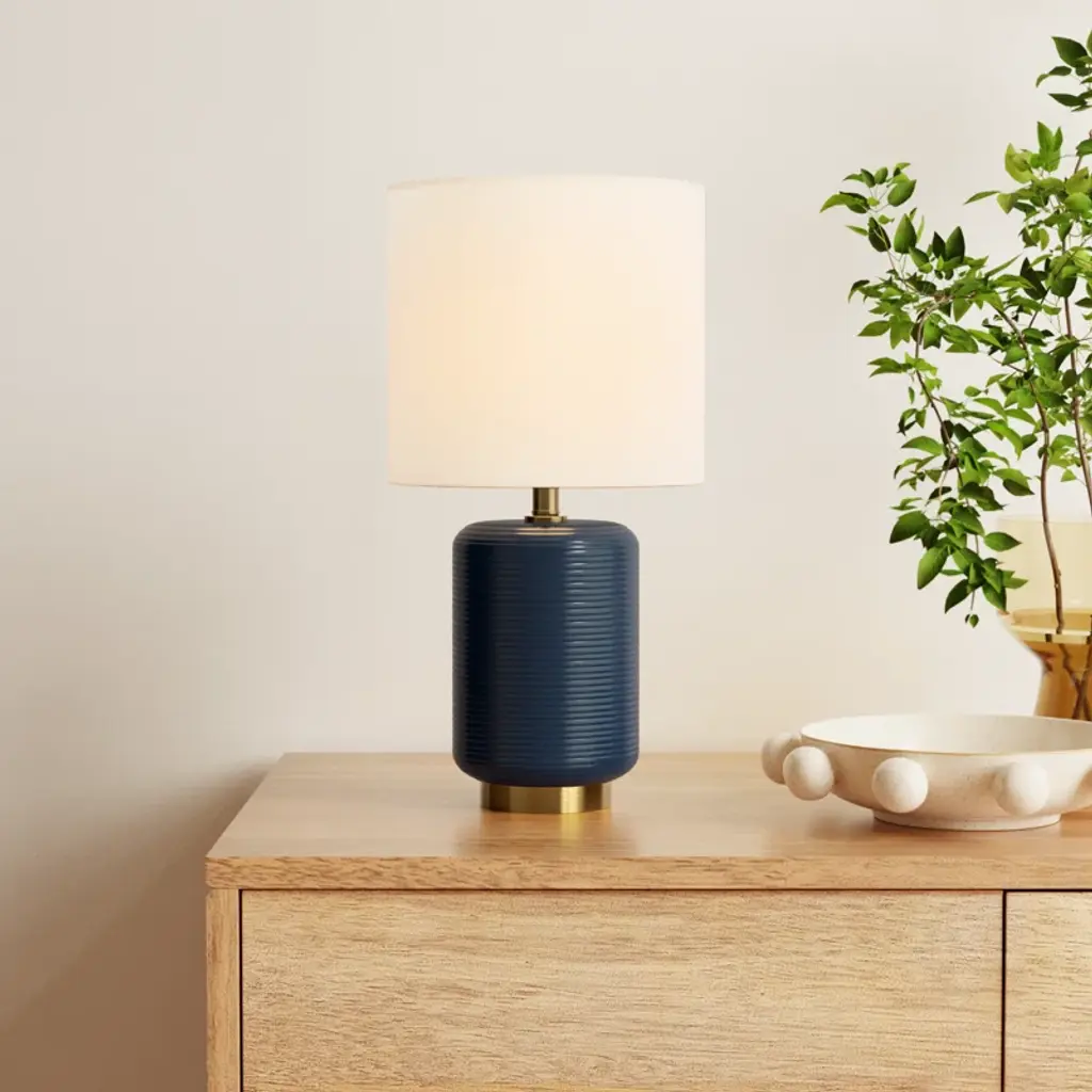 Contrasting finishes and a bold mixed-material look combine in this sleek table lamp. The body is made from ceramic and features a ribbed cylindrical design for added texture and visual intrigue. This lamp sits on a metal base that contrasts the body and, since you get to pick the finish of the body, you can customize it to fit in with your existing color palette. Up top, the white linen drum-shaped shade adds a classic touch, while the lining adds durability. This LED-compatible lamp measures 15" tall and accommodates a single bulb of up to 40W (sold separately).