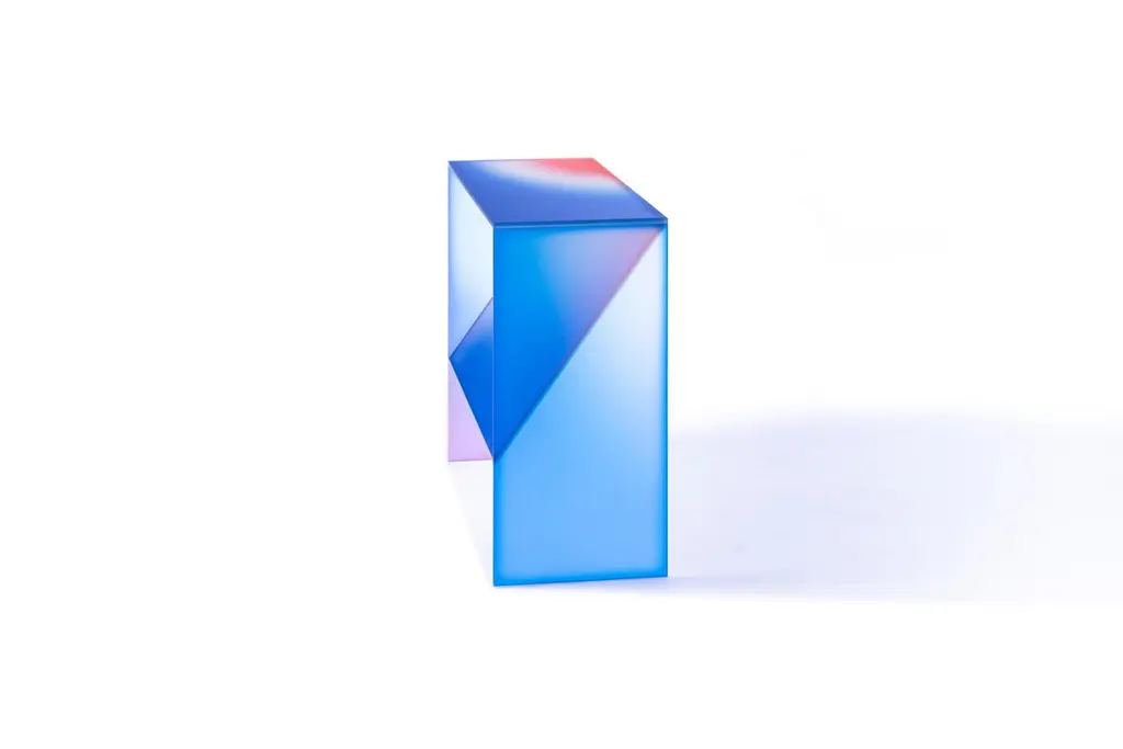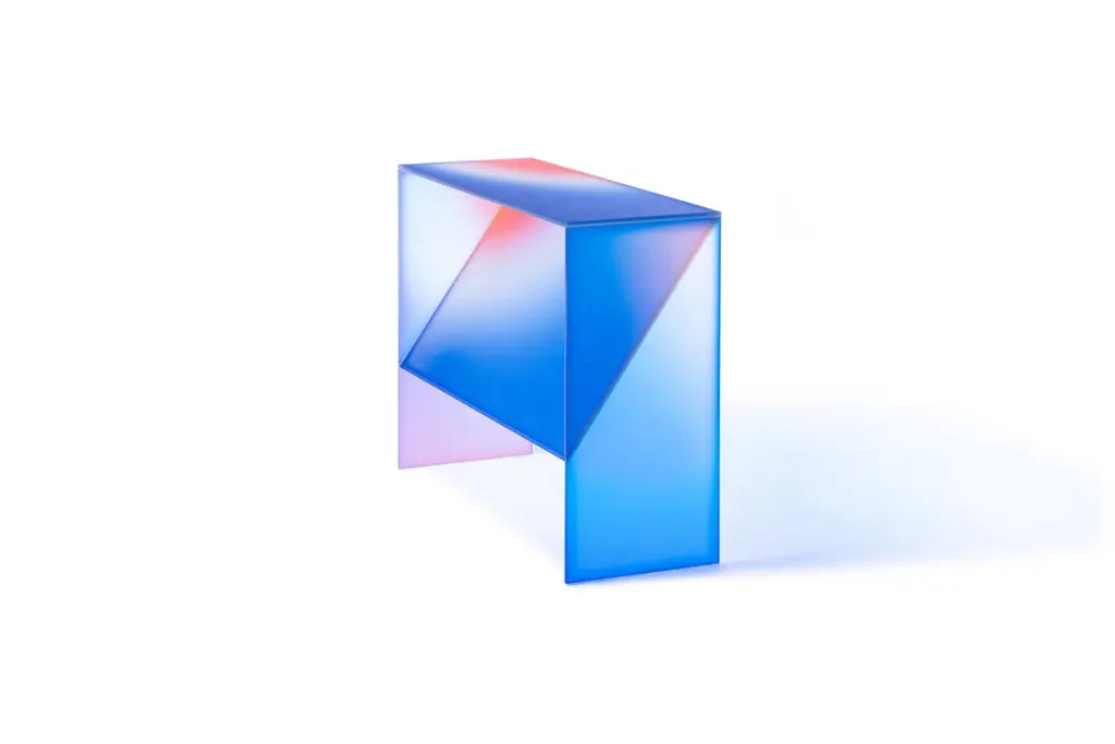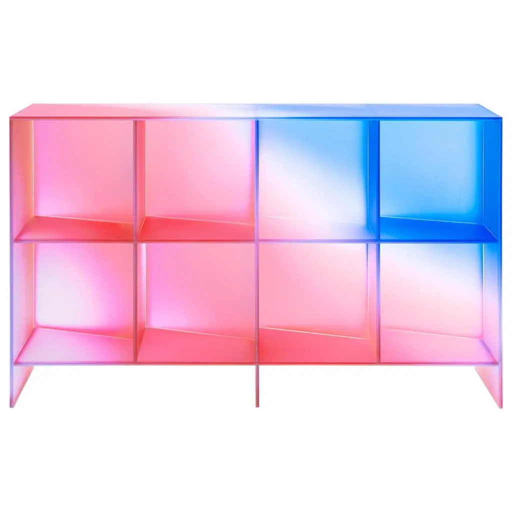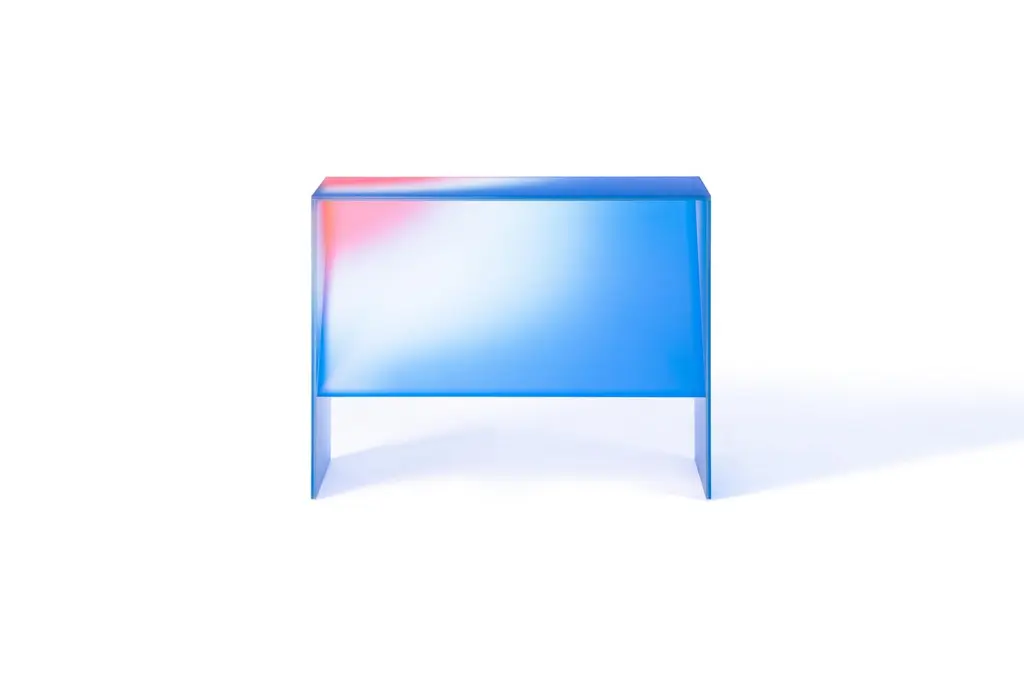 'HALO' collection by Buzao, consoleLaminated dichroic glass, gradient colorsMeasures: 100 x 35 x H 75.5 cmStudio Buzao from Guangzhou (China) is exploring innovation with furniture and lighting design. From marble to lava stone, from electroplated stainless steel to laminated glass: Buzao always works with exclusive materials in a very contemporary style. With this new collection 'HALO', Buzao created a set of furnitures and lightings made of dichroic glass which gives unique gradient colors from pink to blue. We enjoy every minute looking at this piece like a sunset or a rainbow.Halo Collection manipulates and overlays different characteristics of glass and light to transform simple cubic furniture and objects into enigmatic sculptures.Halo Collection comprises various display units, a wall hanger, mirror, floor lamp and table lamps. Buzao is a radical offshoot of Bentu. The Buzao name means ‘I don’t know’ in Chinese, to signify that all true exploration has an unknown destination.