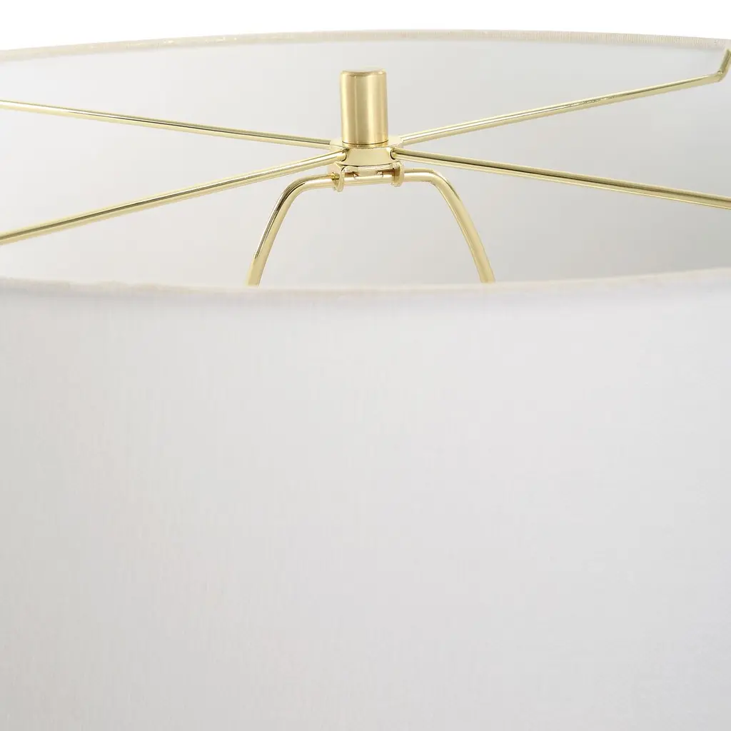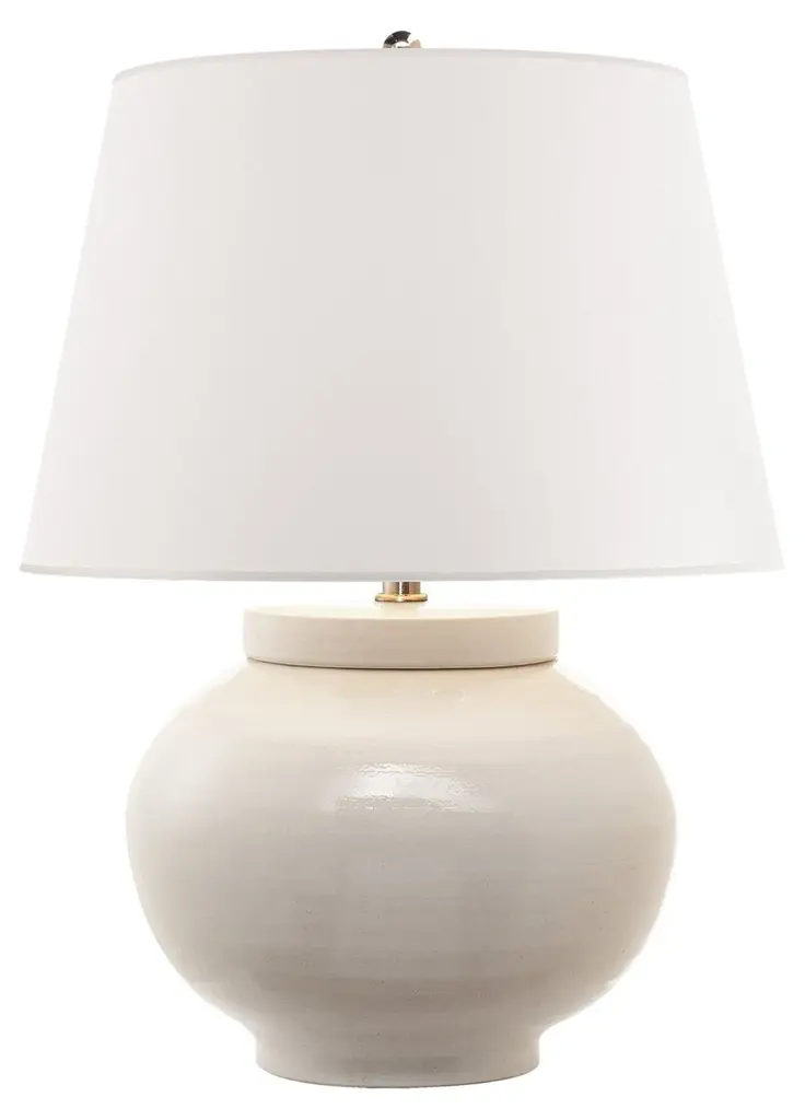 The Grady Table Lamp embodies a classic yet timeless elegance, showcasing an oversized ceramic base with exquisite detailing. Its design is enhanced by lightly antiqued brass accents, adding a touch of sophistication. The lamp is crowned with a slightly tapered round hardback shade, enveloped in pristine white linen fabric, creating a harmonious blend of style and function. This lamp is a perfect addition to any space, offering both illumination and a statement of refined taste.