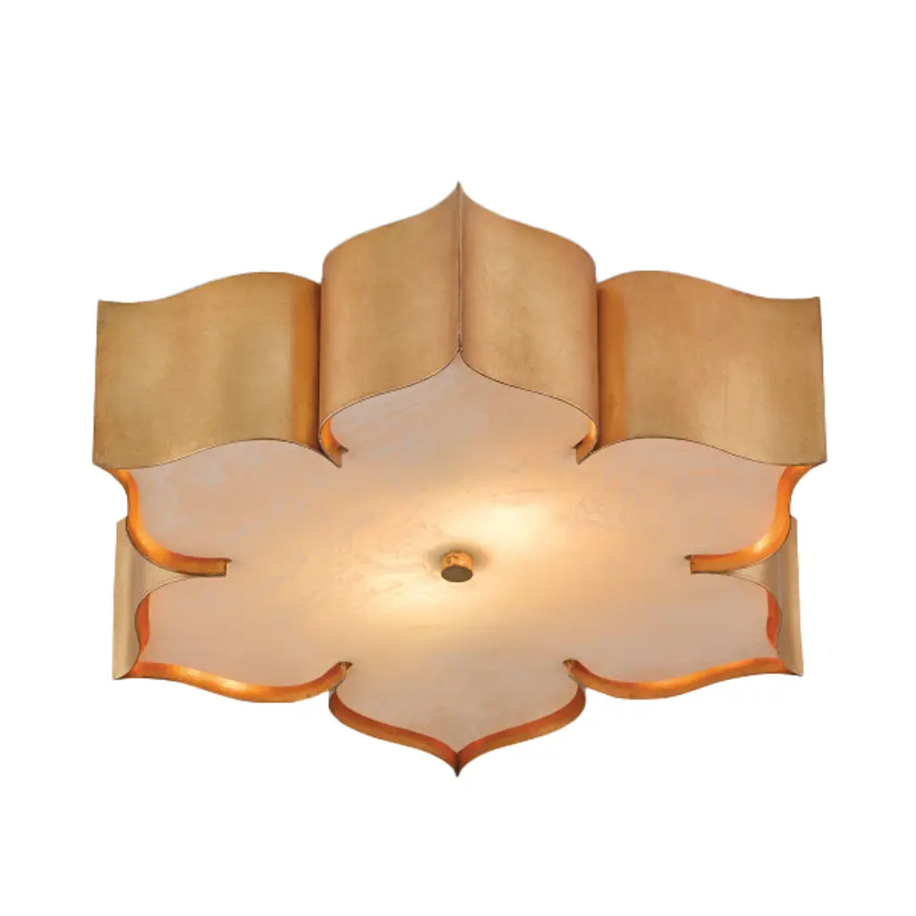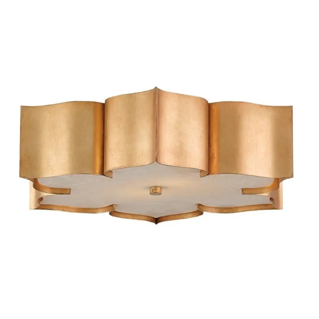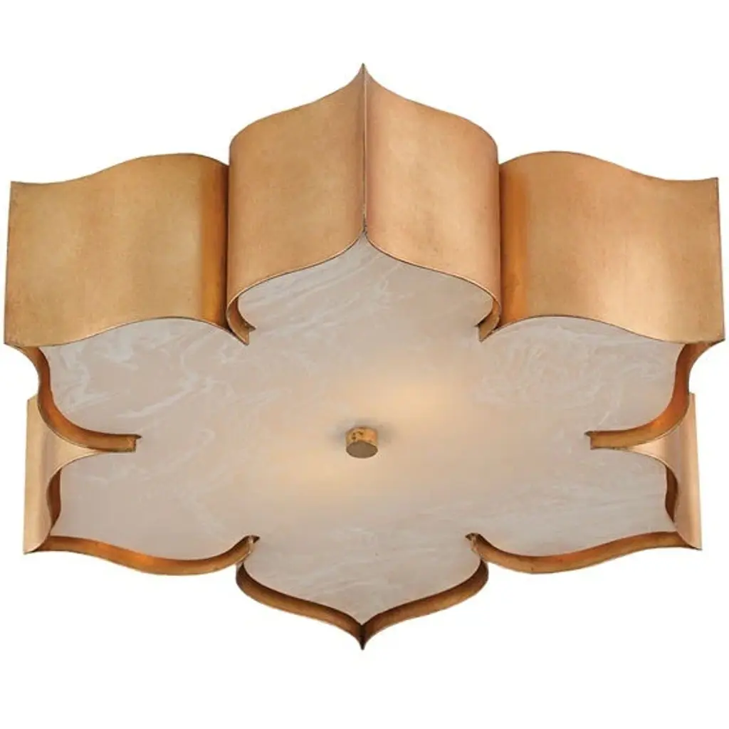 Talk about a statement piece! This two-bulb light fixture is has the silhouette of a lotus flower. Featuring an antiqued gold leaf finish atop wrought iron and a marbleized acrylic diffuser. A stunning addition for a foyer, hall, or powder room.