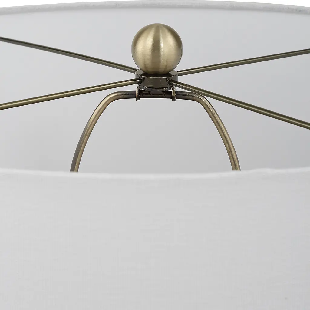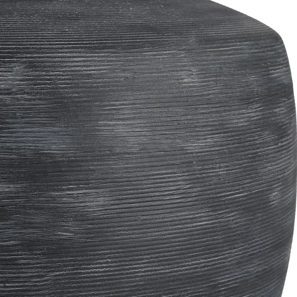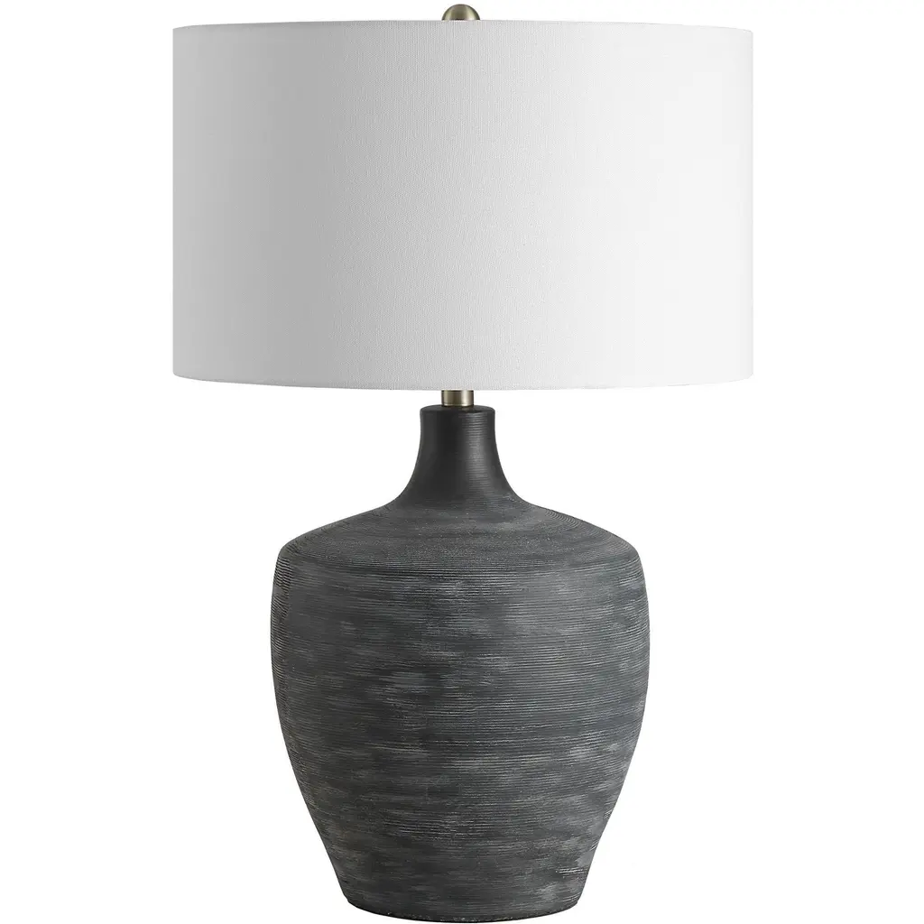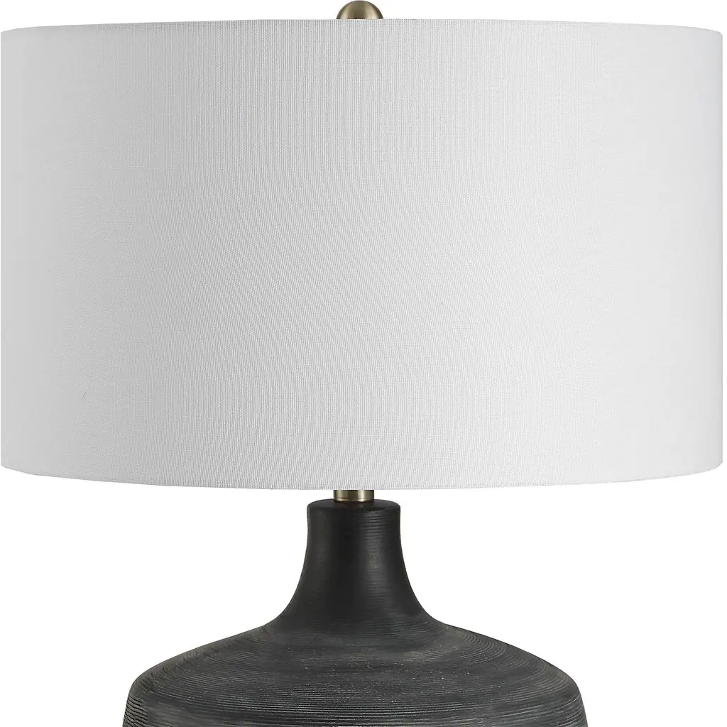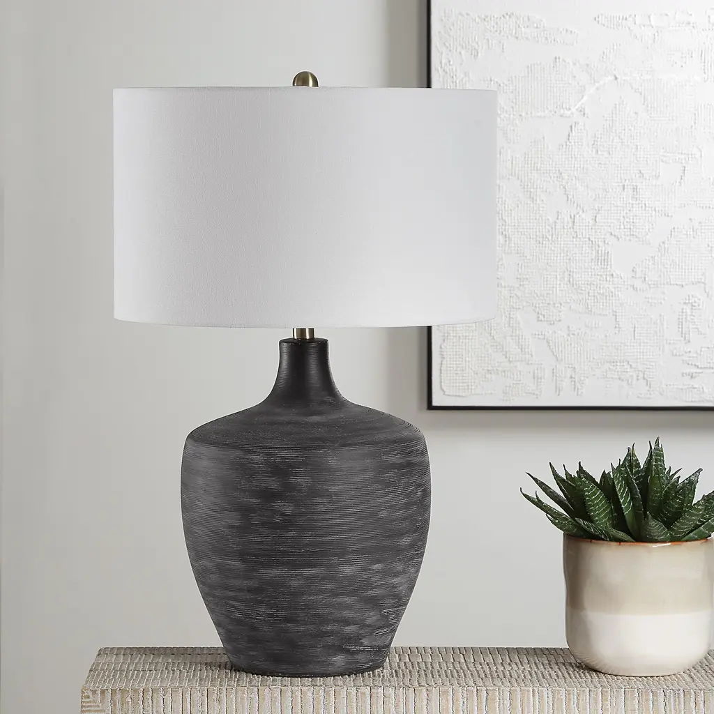 The Graphite Table Lamp Features A Large Ceramic Base In A Distressed Charcoal Finish With Intricate Ribbed Detailing And Antique Brass Plated Hardware. The Round Hardback Drum Shade Is Made In A Casual White Linen Fabric.