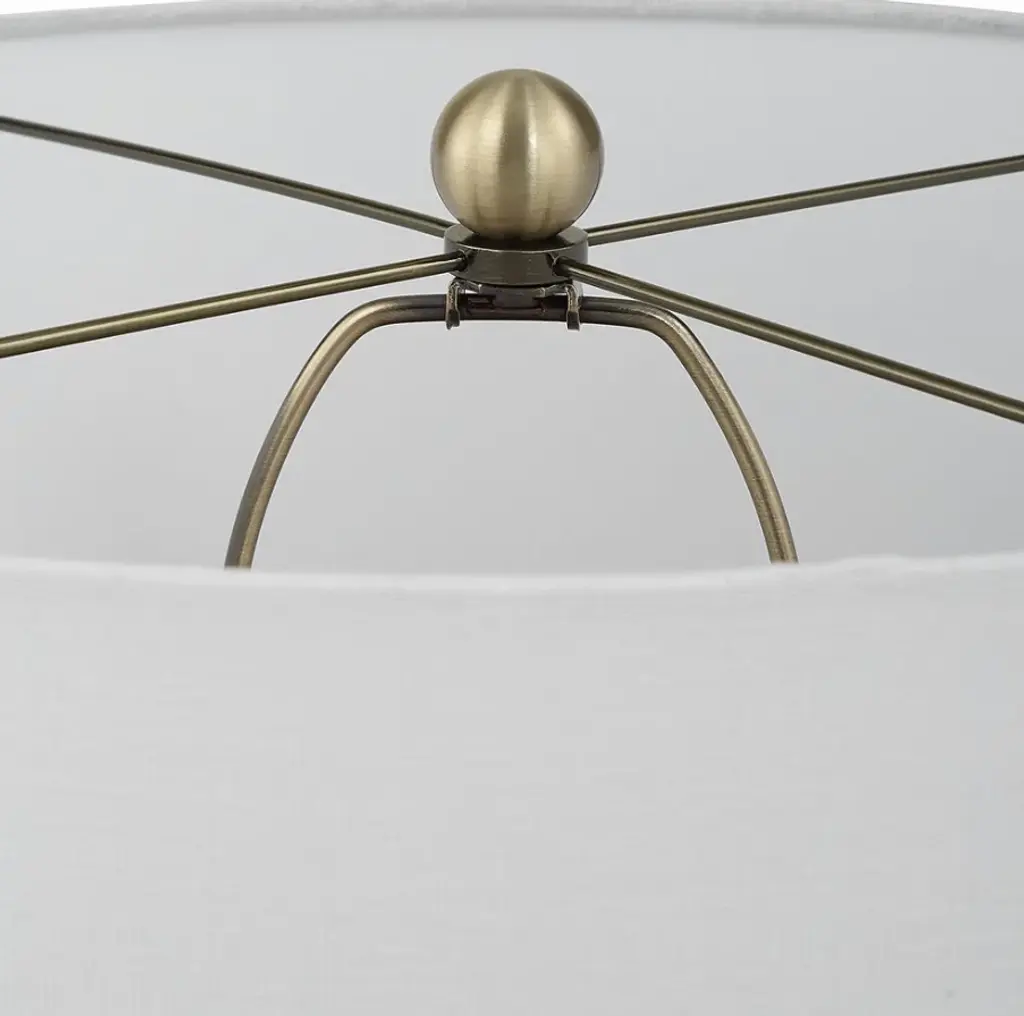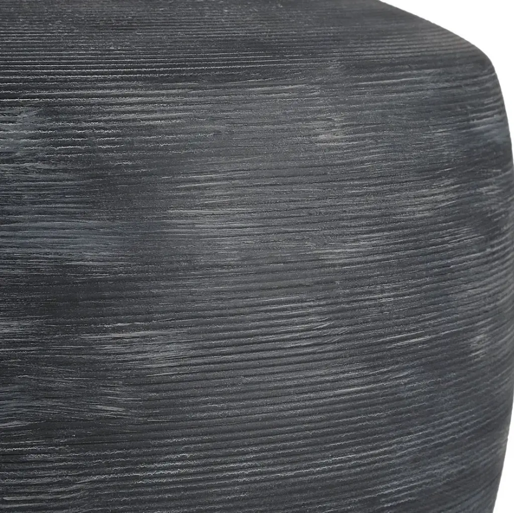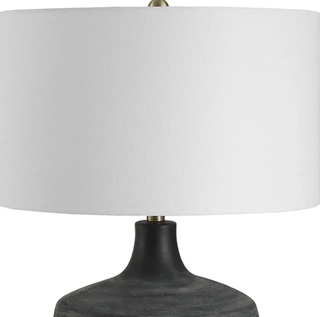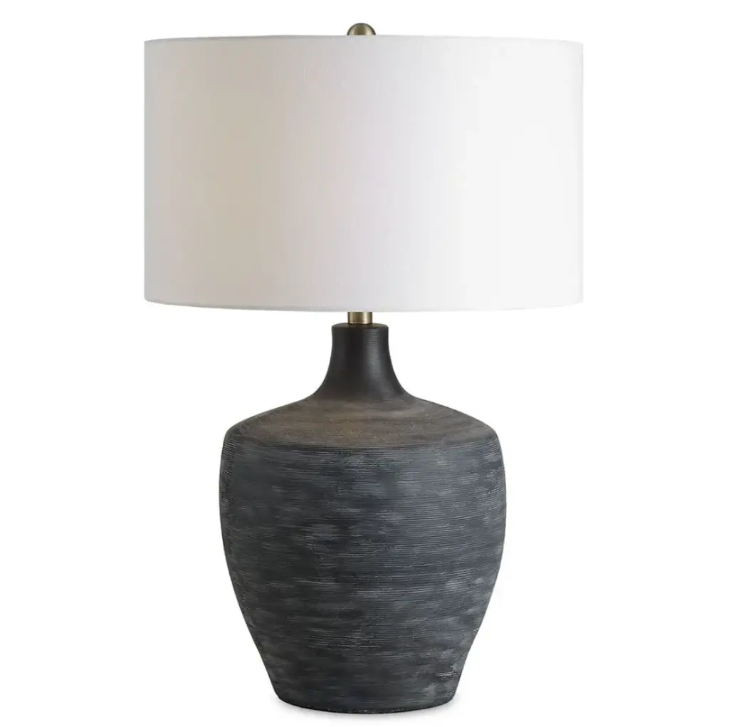 The Graphite lamp is designed with a ceramic base in a distressed charcoal finish with intricate ribbed detailing and antique brass plated hardware. Completed with a round hardback white linen drum shade.