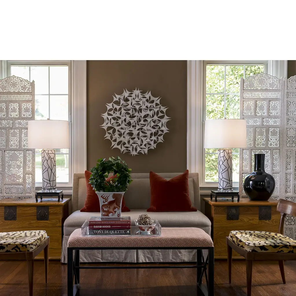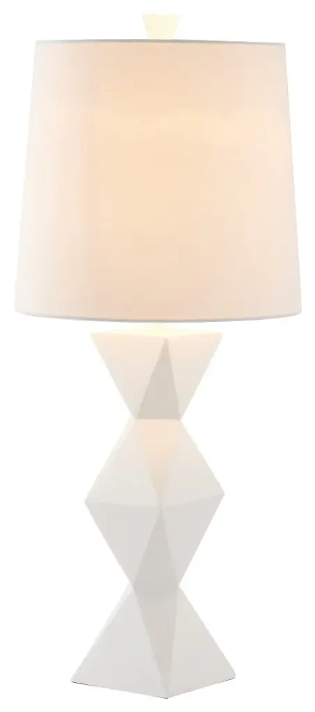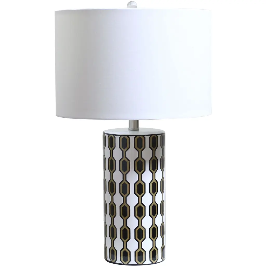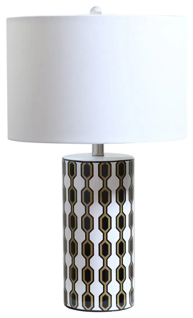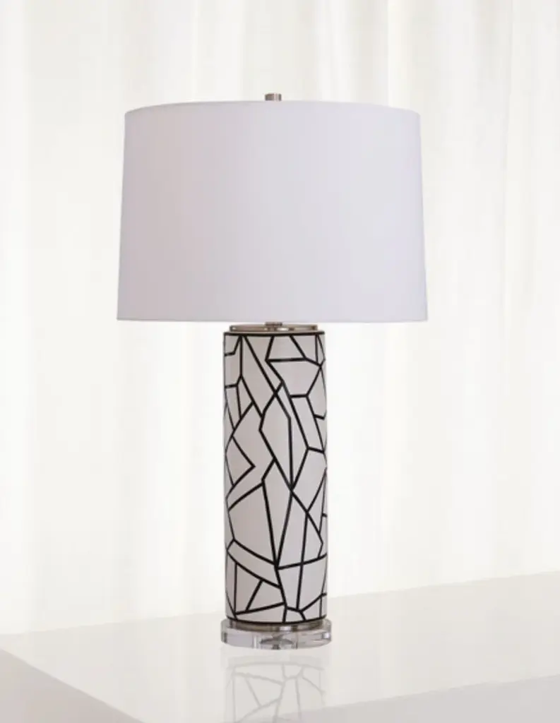 The Graphix lamp by Port 68 features a geometric crosshatch pattern in black over a matte white porcelain lamp base. The Graphix pattern wraps around this clean, column style lamp base. Handcrafted porcelain table lamp. Features a cylinder shaped brushed nickel finial, and Lucite round base. Accented with brushed nickel hardware. Polyester shade dimensions: 18"Dia. x 12"T. Uses one 100-watt bulb. Three-way switch. Overall: 18"Dia. x 32"T. Cord length: 6 ft. UL approved. Imported. Boxed weight, approximately 22.2 lbs. Free shipping in the U.S.