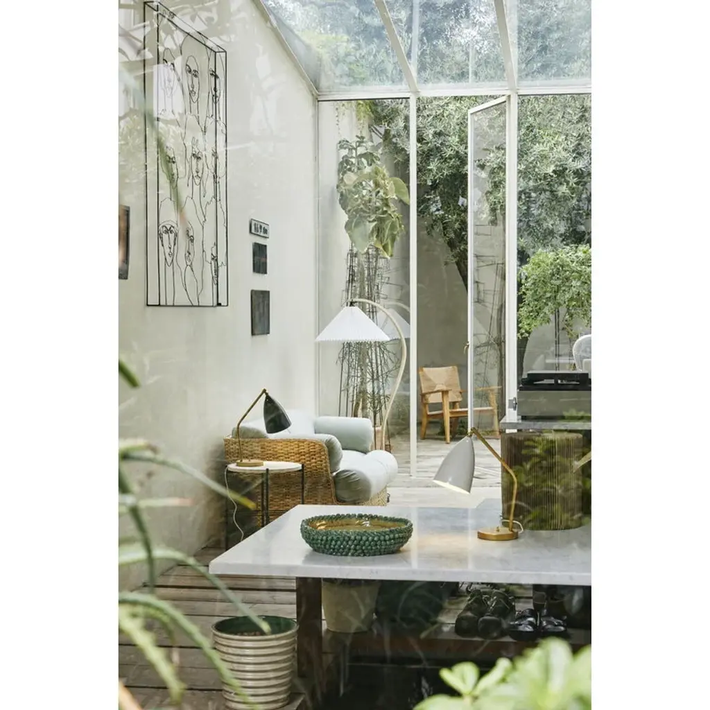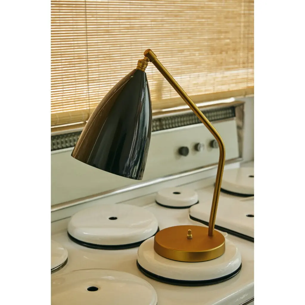 GUBI's Gräshoppa table lamp is based on a luminaire designed by Greta Magnusson. The original Gräshoppa was first introduced as a floor lamp in 1947 and reissued in 2011. The Gräshoppa table lamp features the same timelessly beautiful bell-like shade as the floor lamp, made of polished steel. Brass details complete the luminaire's luxurious look. The elegant table lamp is ideal for a home office, living room or as a reading light in a bedroom.