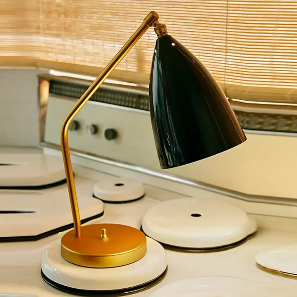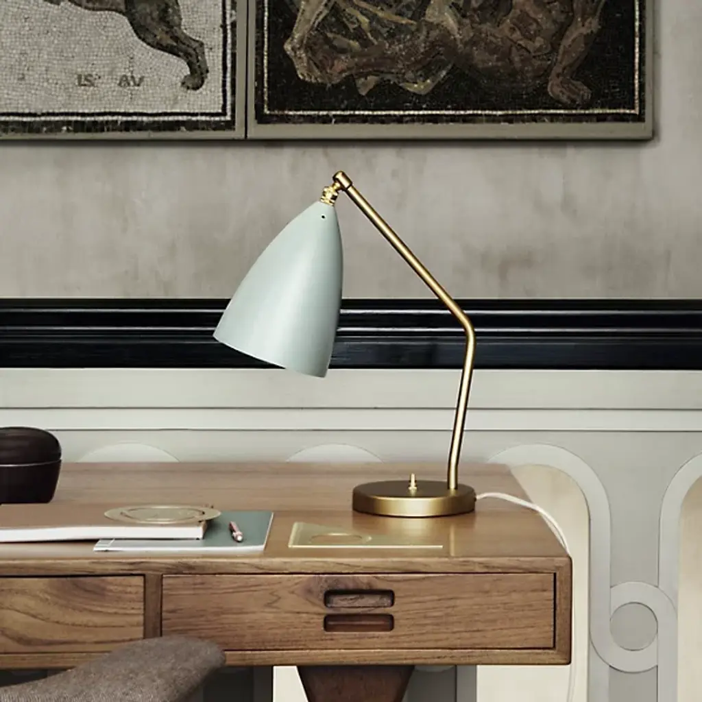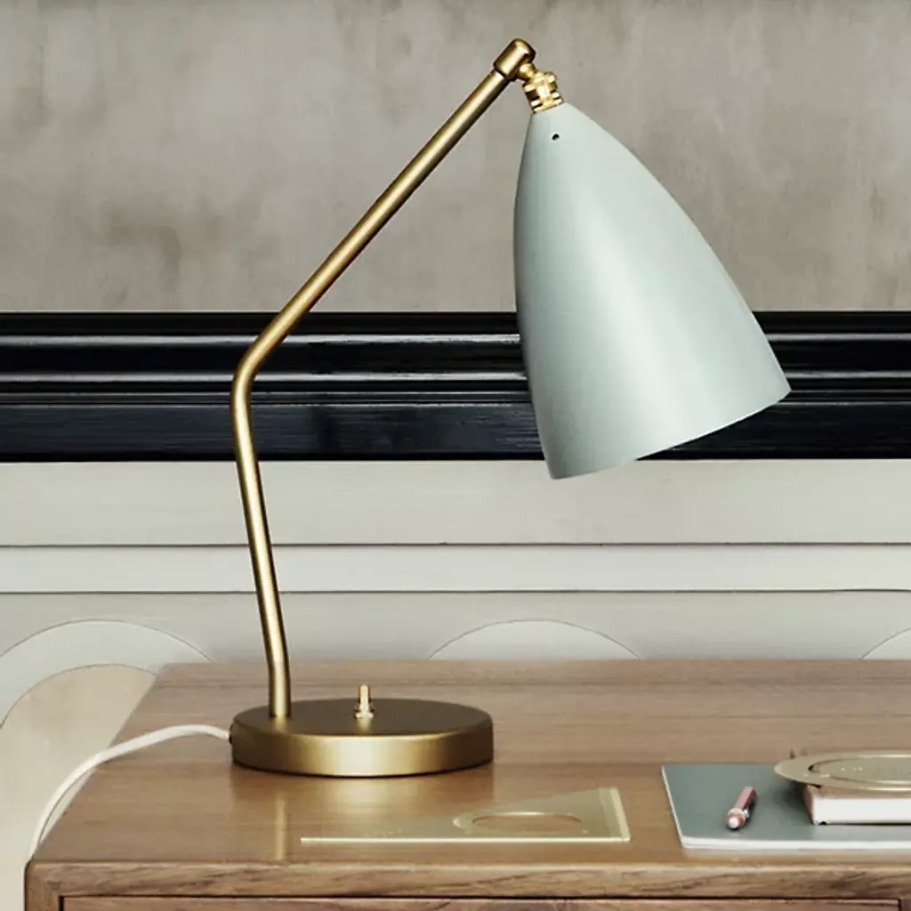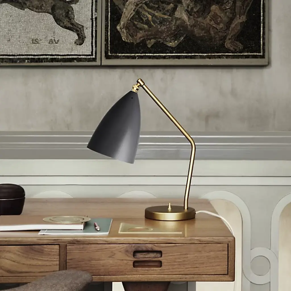 Designed in 1948, the GUBI Gräshoppa Table Lamp clearly defines the mid-century modern style that emerged out of California at that time. Designed by Greta Grossman, the Grasshopper embodies the industrial and functional requirements heralded by European Modernism, but offers a more toned down and refined version that could comfortably fit in chic residences. The smooth aluminum and brass components are inspired by organic forms and come together in an adjustable fixture that creates ideal task lighting.