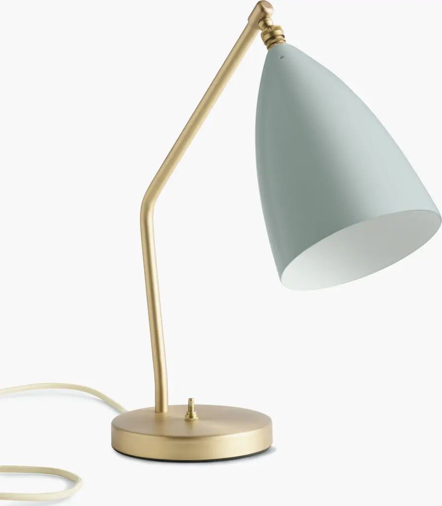 Upon moving to California in 1940, Swedish architect Greta Magnusson Grossman began combining her European training with a West Coast aesthetic, adding a sense of play. Her Grasshopper Table Lamp (1948) resembles its namesake in form, with a lithe solid-brass frame and elongated conical shade. Ball-jointed, the shade can be moved in any direction to focus the light and minimize glare. This is an authentic Grossman lamp. Bulb (not included): 40W max, E12 base. Made in Denmark.