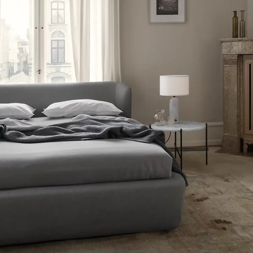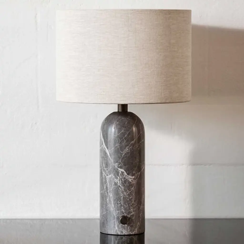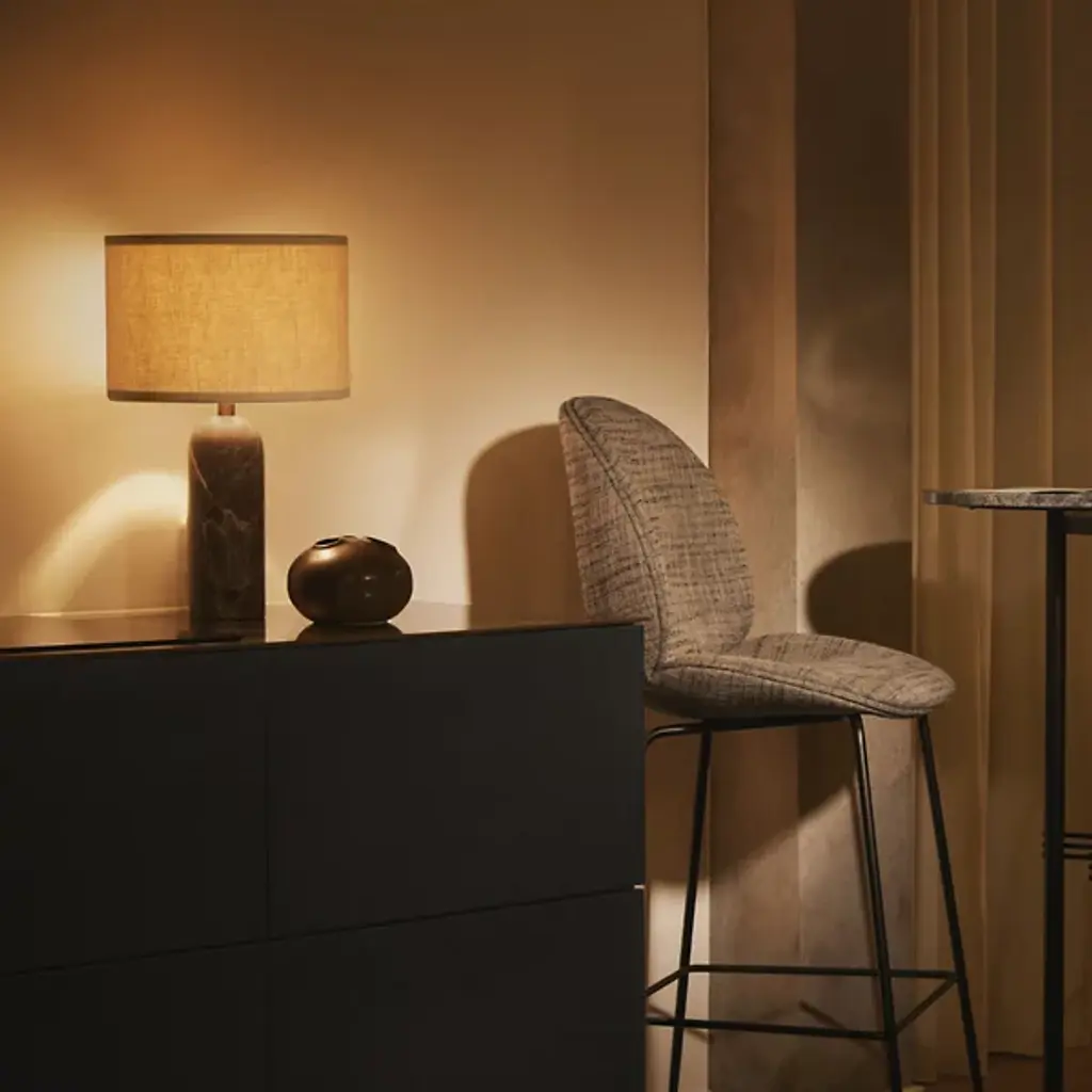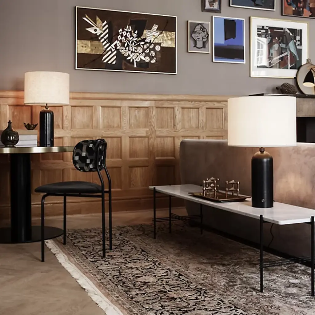 The sleek lines and unforgettable form of the Gravity Table Lamp from GUBI create an aesthetically pleasing contrast of strength and fragility. Designed by Space Copenhagen, a design studio collaboration of Signe Bindslev Henriksen and Peter Bundgaard Rützou, it incorporates their experience in multiple mediums and design philosophy of balancing opposites. The lamp gets its name from the juxtaposition of a robust cylindrical base with a single socket and the light, airy drum shade that floats above it, easing excess glare into a warm glow that reflects across the fixture’s smooth base below.